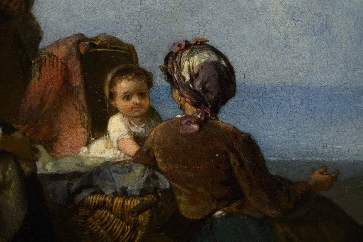 The mother with the children on a terrace with various jugs, bowls and buckets and a view out over the water to the sailors. Slight traces of age.