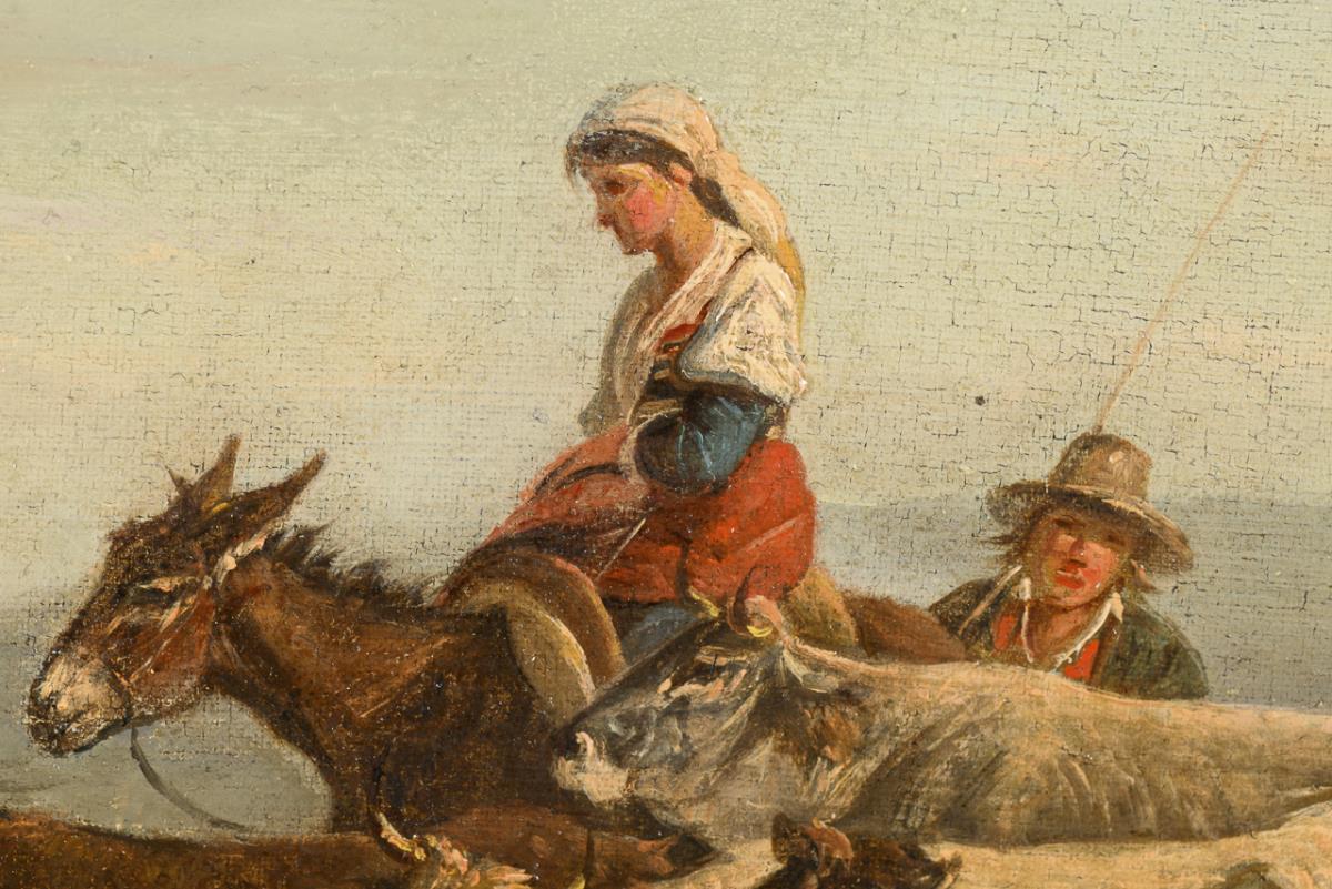 Peasant couple with a horse and a herd of cattle in the bright light near a lakeside. Canvas relined, retouched in the sky.