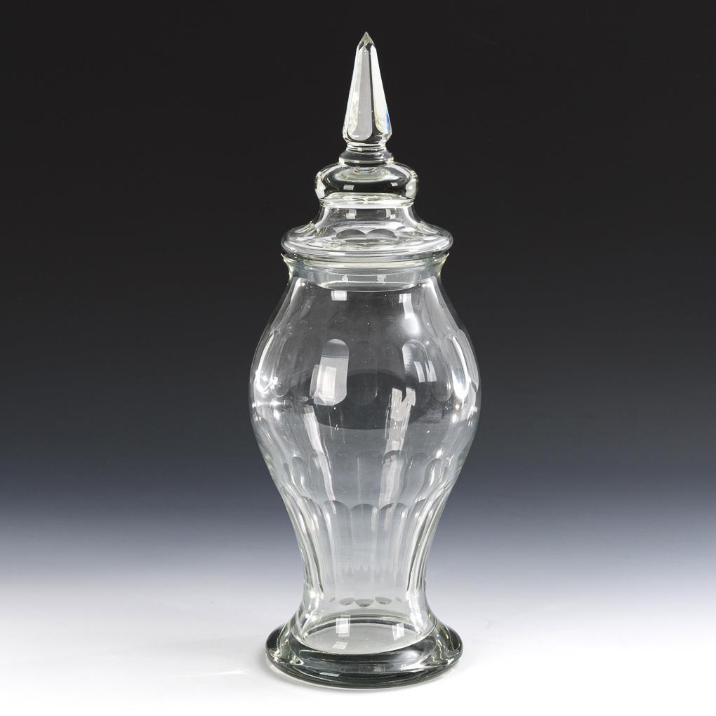 Baluster vase with facet cut bands and knob lid.