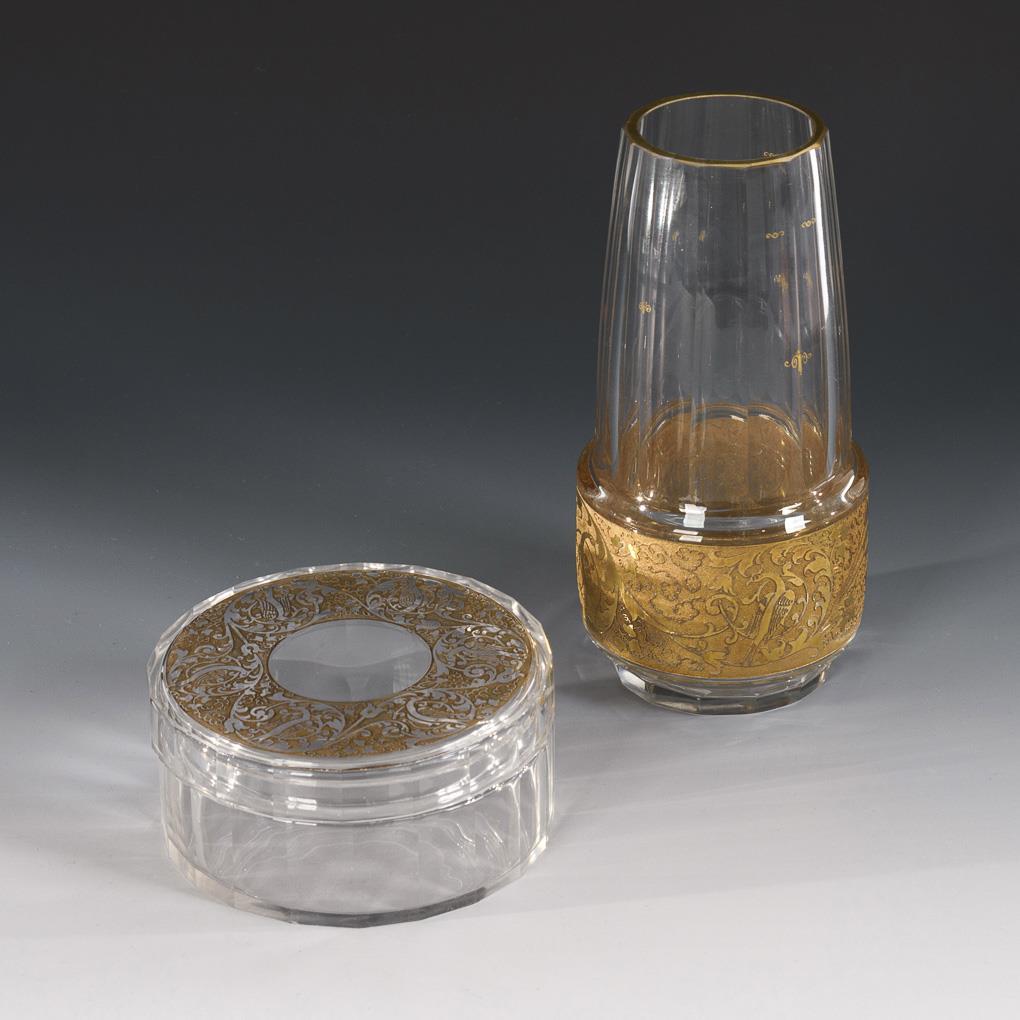 Colorless glass, gold decoration. Vase (h 20.5 cm), box (h 6.5 cm).