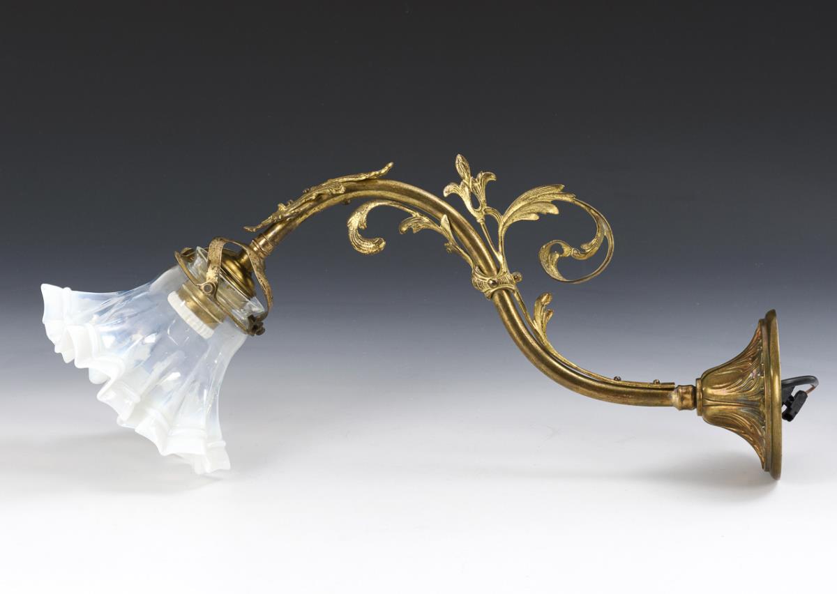 Round wall mount with acanthus relief, curved shaft with leaf trim, screw mount in glass shade with pinched edge. Metal slightly rubbed.