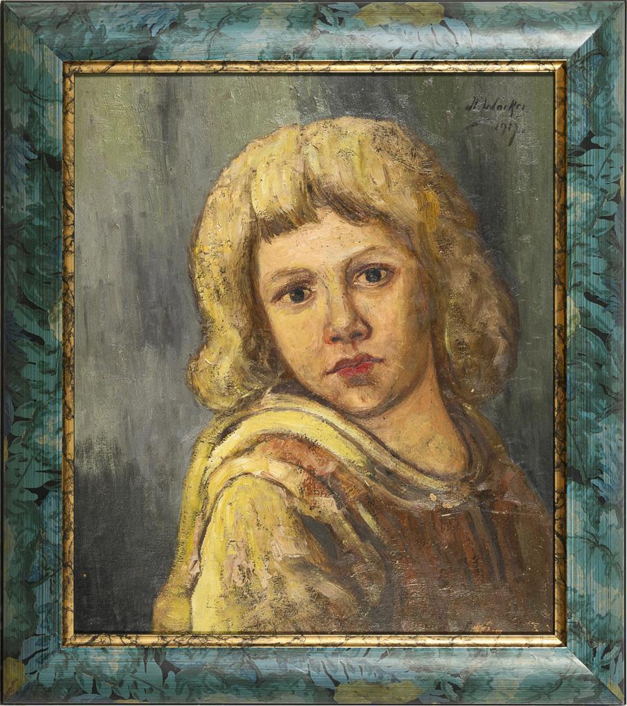 Portrait of a serious looking child with blond hair. Slight traces of age.