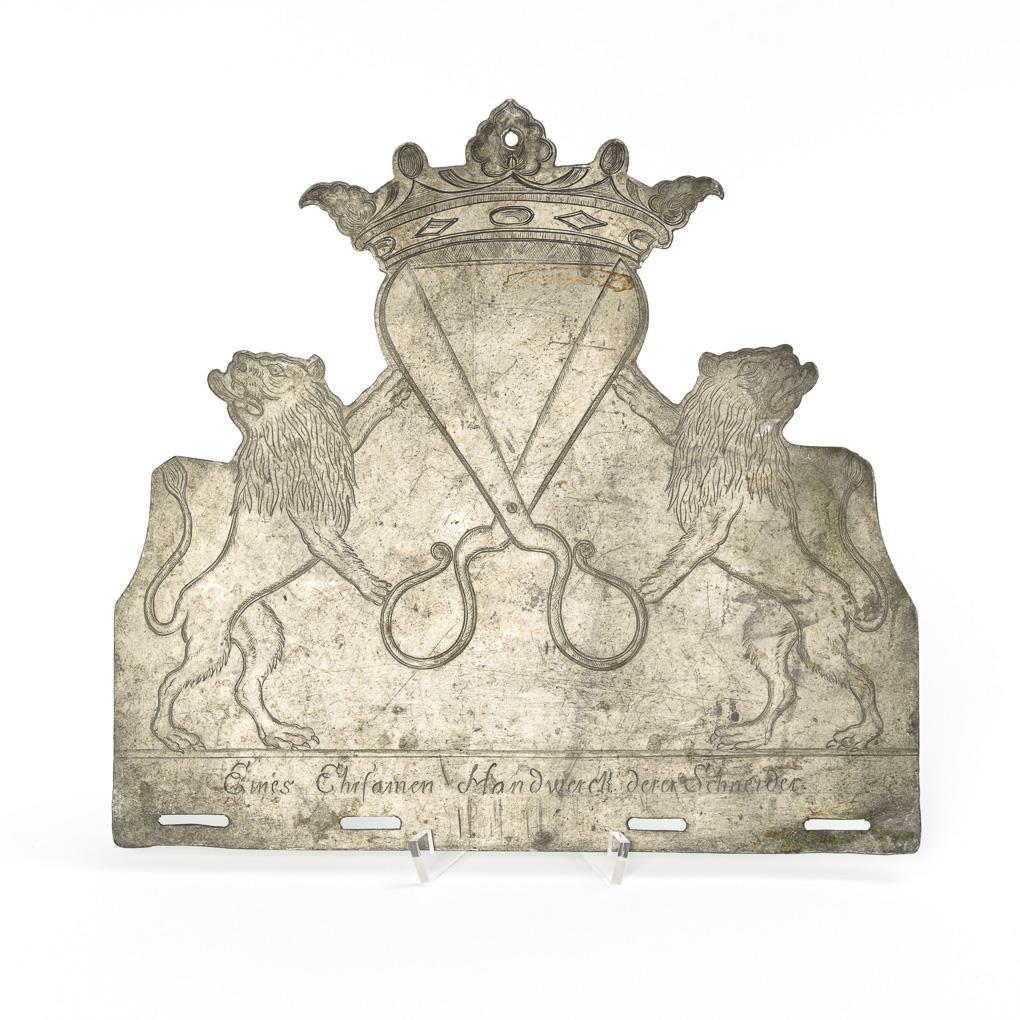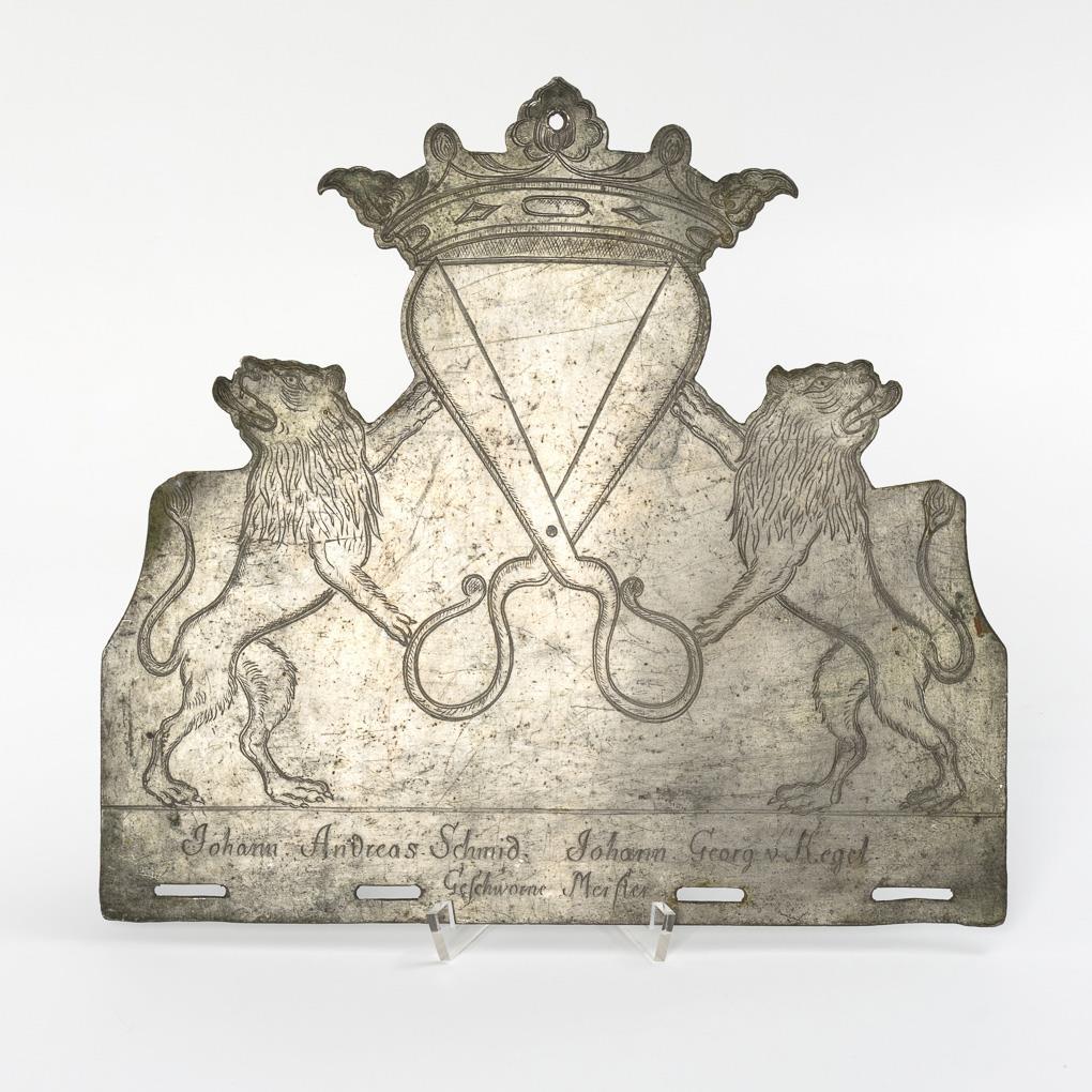 Engraved guild mark on both sides with scissors held by lions under a crown. In the lower area above the slots for mounting the inscription "Eines Ehrsamen Handwerck derer Schneider" and on the other side "Johann Andreas Schmid, Johann Georg Keget. Geschworne Meister". Subsequent drilling on the crown, slight signs of age/use.