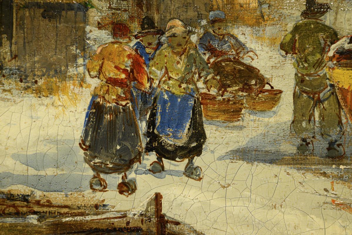 Villagers with the fishing boat on the frozen river near the mill on a winter's day. Traces of age.