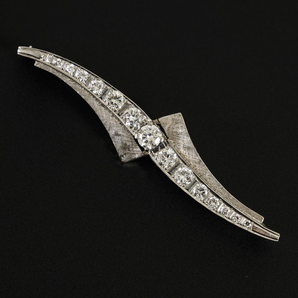 White gold 585, HANDCRAFT stamped. Center stone approx. 0.50 ct. L 7.5 cm x 1.7 cm (center). White/vvs. 10.0 g.