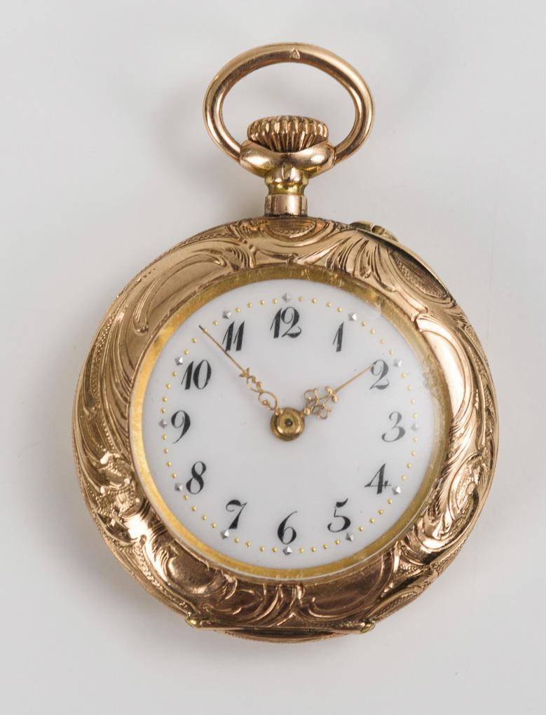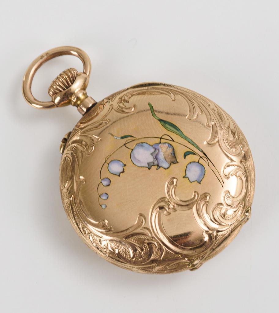 585 gold case decorated with engraved rocailles and enameled lilies of the valley, white enamel dial with Arabic numerals and Louis Quinze hands, movement with cylinder escapement, running. Gilt brass clock holder with the antique-style figure relief of the goddesses Flora and Fortuna, round clock holder with crowning bow, on a black wooden base. Slight signs of age and wear, dial glass with small chips, 1 enamel flower defective.