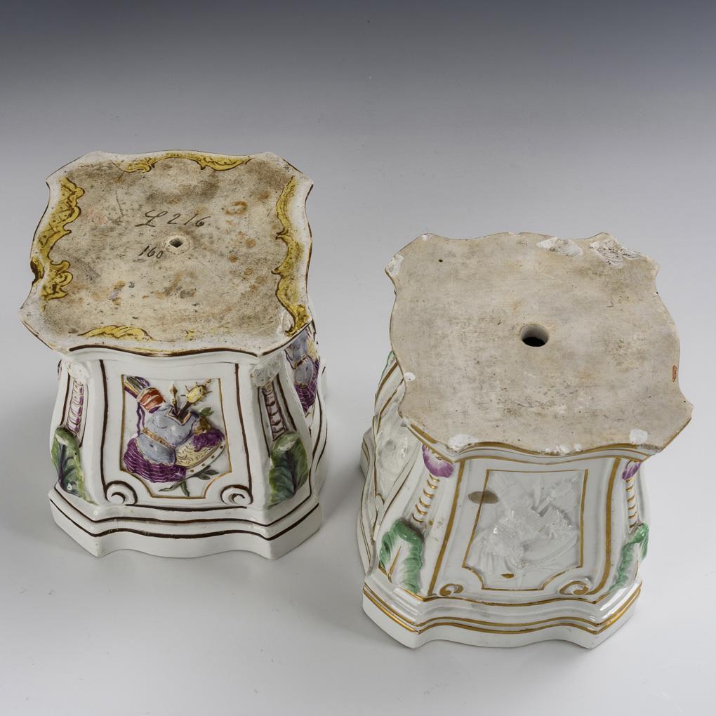 Square, fitted base with one cartouche with trophy relief on each side, these 1x painted in color and 1x white. Bumped edges, partial gold abrasion.