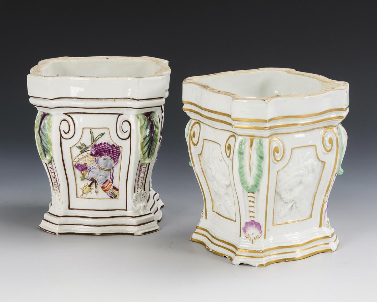 Square, fitted base with one cartouche with trophy relief on each side, these 1x painted in color and 1x white. Bumped edges, partial gold abrasion.