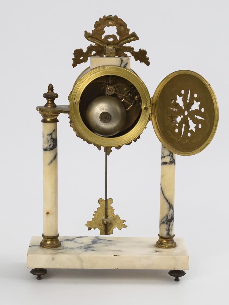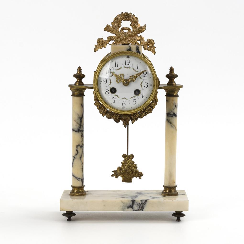 Elegant portal clock with 2 columns and a crowning rosary with torches and ribbon. Slight signs of age, crowning slightly bent.