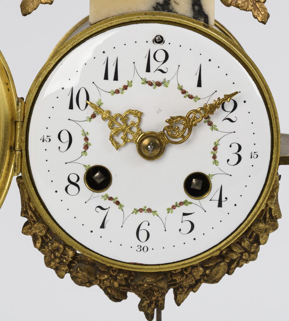 Unmarked movement with half-hour strike on bell. In need of revision and cleaning. Glazed, white enamel dial with colored festoon painting, Arabic numerals, minute track and Louis Quinze hands.