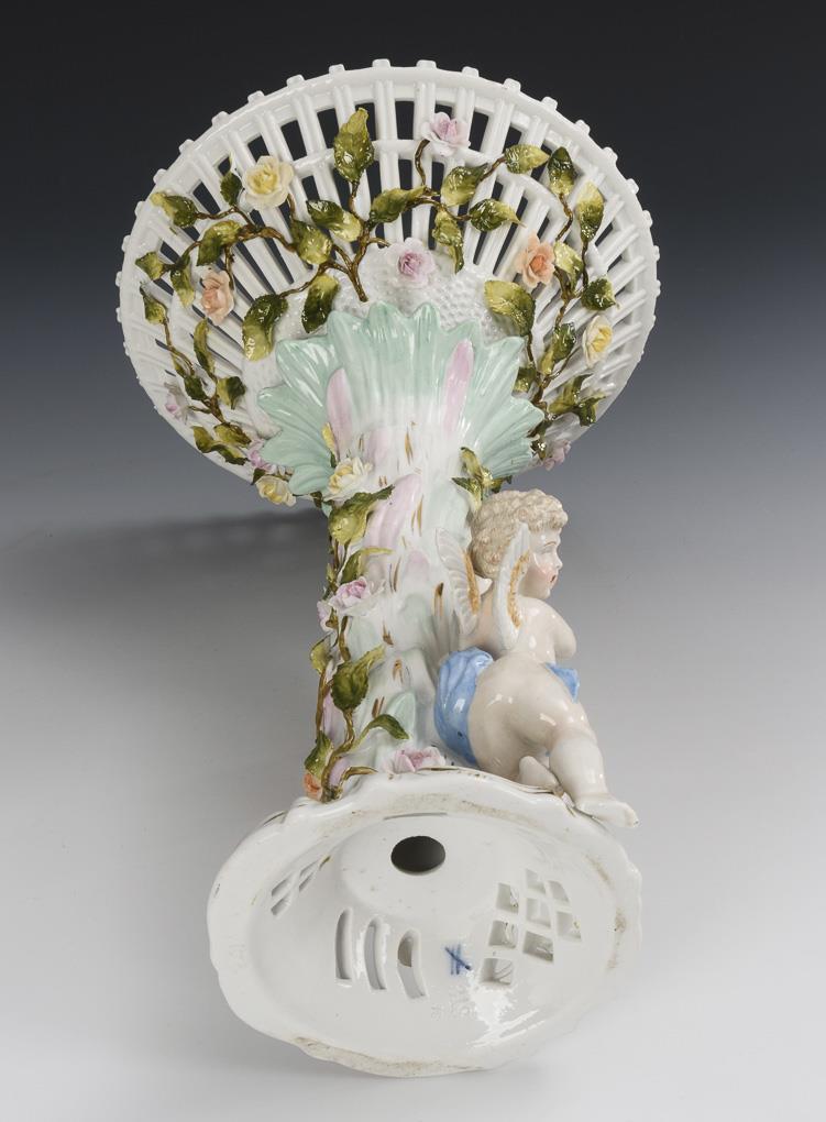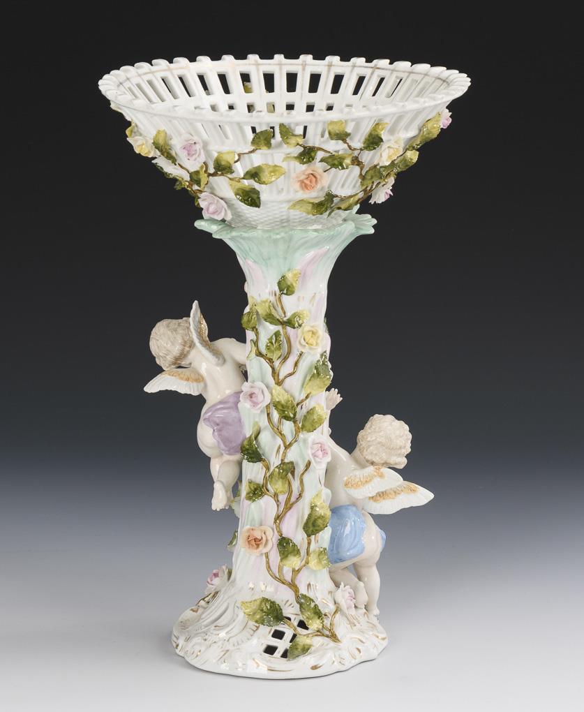 Rose-covered, conical basket on a rose-covered tree trunk shaft with two putti, rocaille foot. Minimal chips to the covering, bell handle chipped.