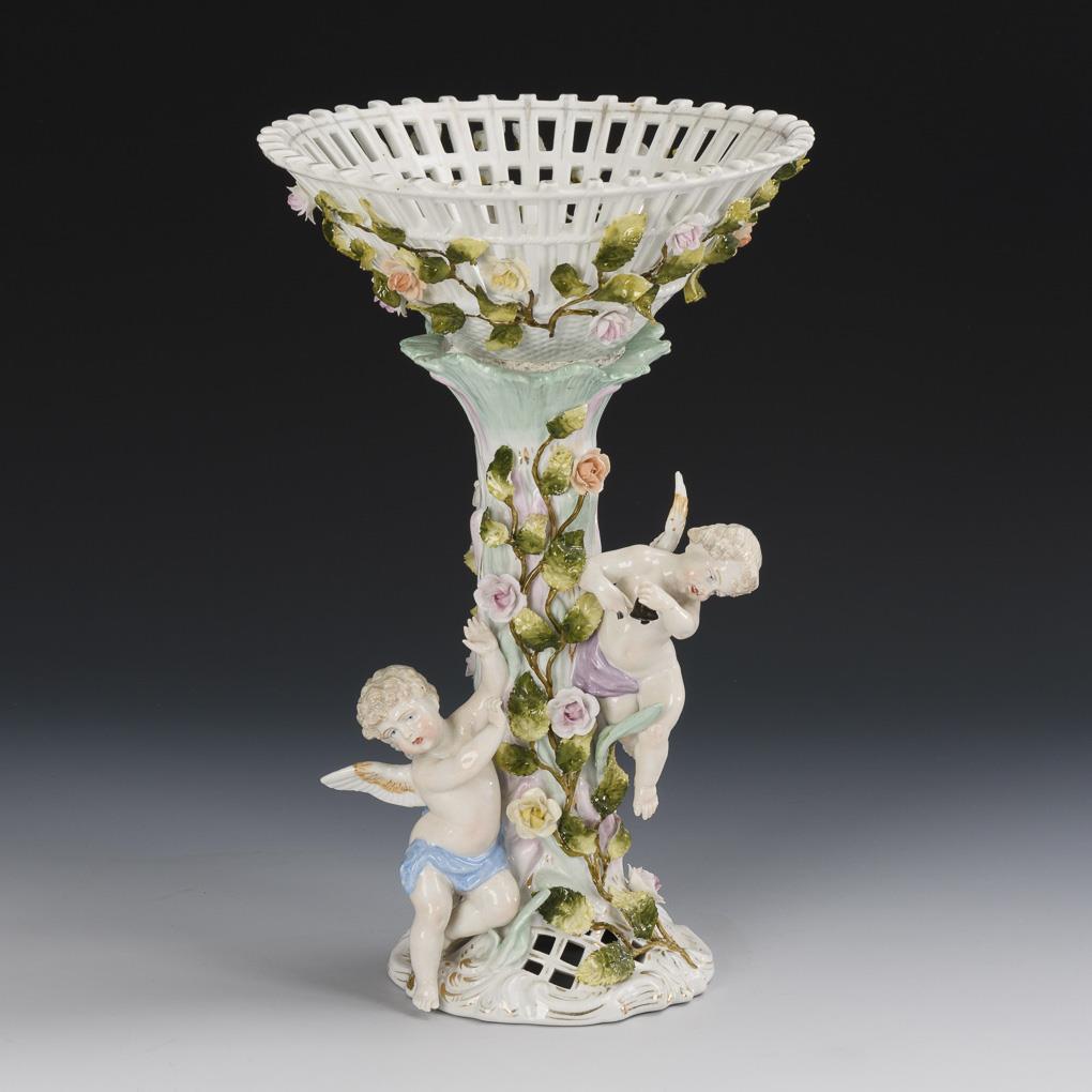 Rose-covered, conical basket on a rose-covered tree trunk shaft with two putti, rocaille foot. Minimal chips to the covering, bell handle chipped.