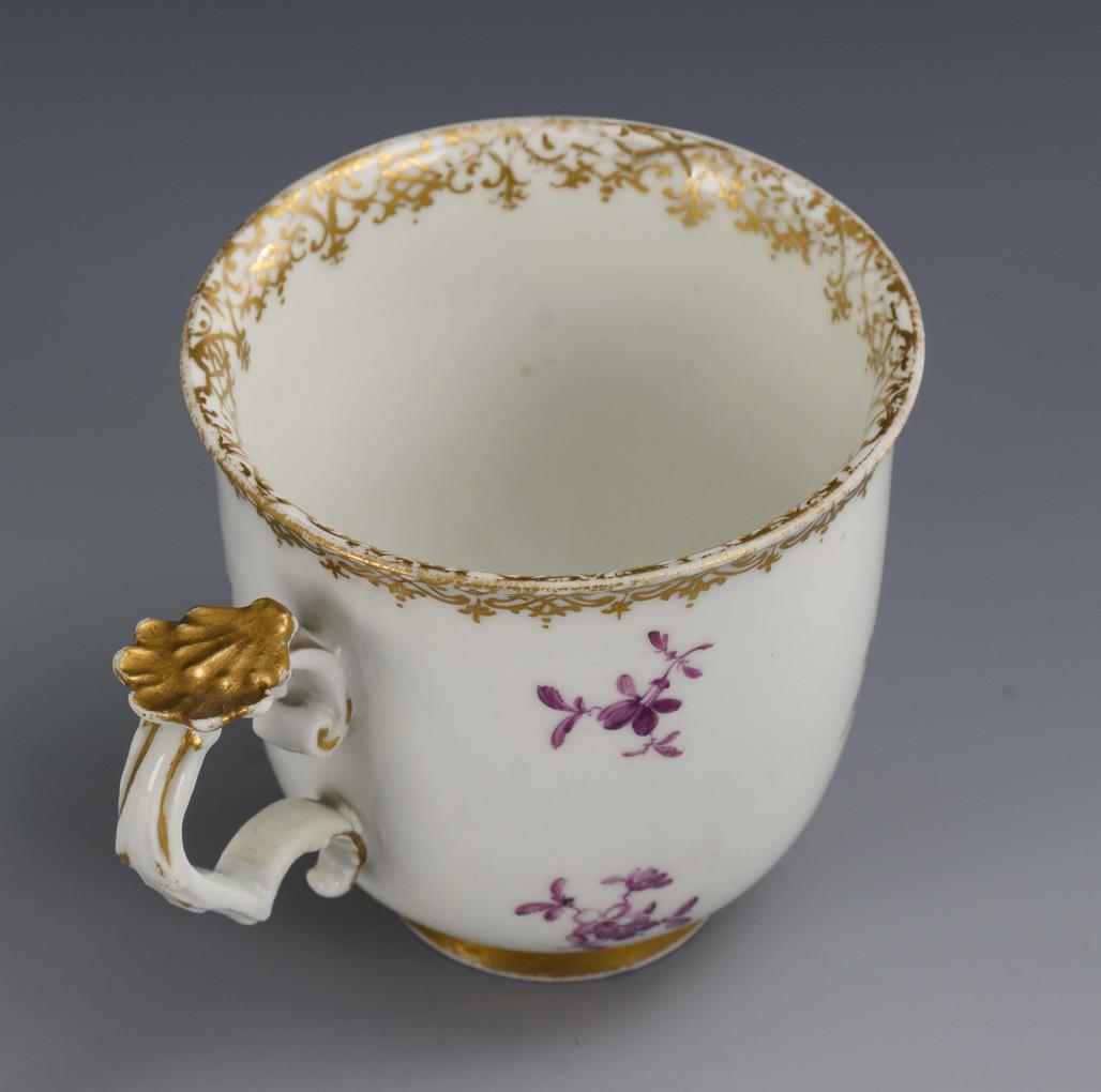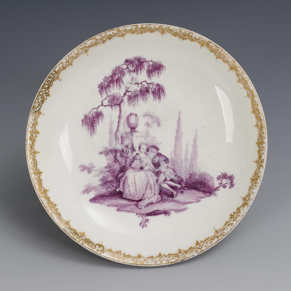Bell-shaped cup with rocaille handles. The front and the mirror of the saucer depict a gallant couple in a park landscape. Minimal wear to the gold, restoration to the rim of the cup and saucer, the mirror of the saucer rubbed.