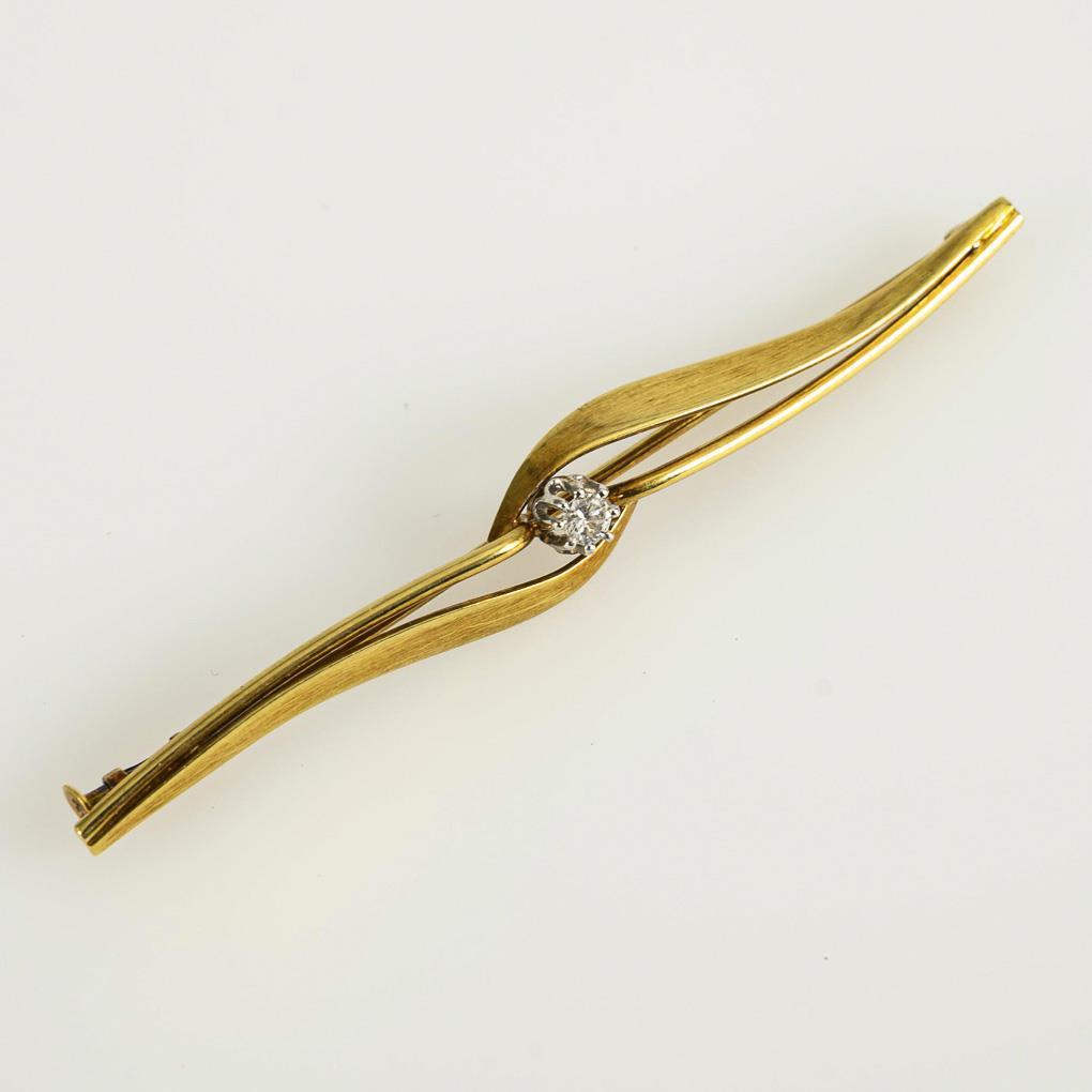 Tested yellow gold/white gold 585. Brilliant approx. 0.10 ct. Brooch L 7 cm. 4,8 g.