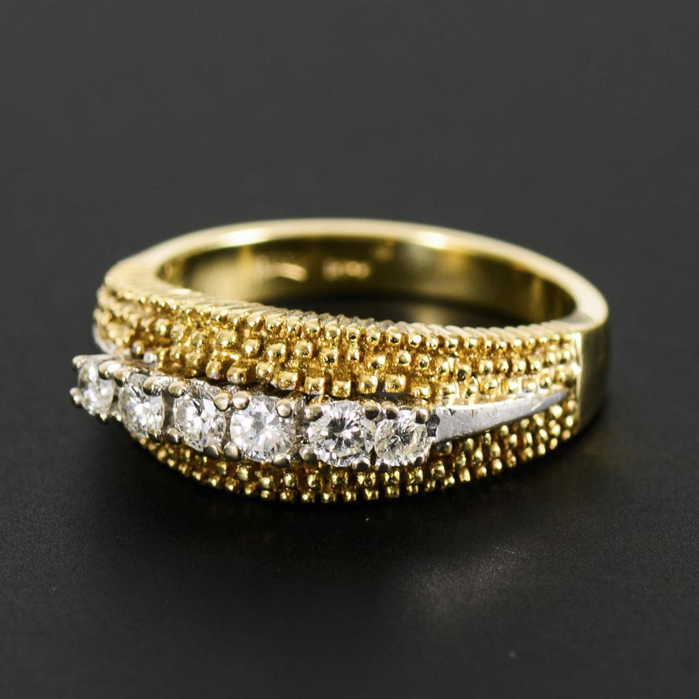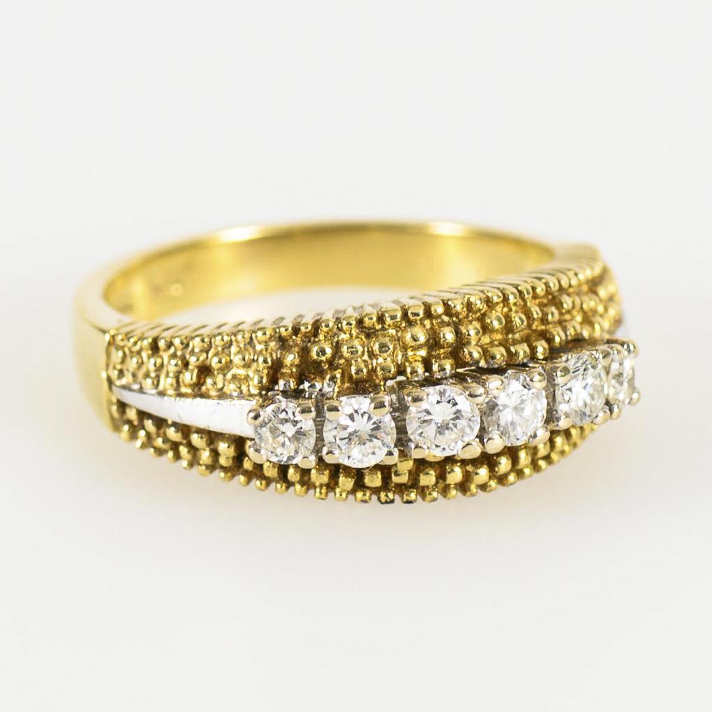 Tested yellow gold/white gold 585, indistinctly stamped. Ring size 55. 9.1 g.