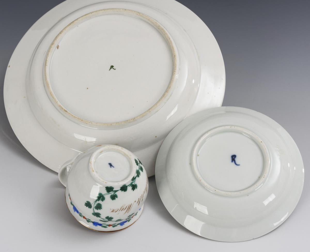 1x dinner plate with underglaze green leaf border and the monogram "W.R." in the mirror (Ø 23 cm). / 1x cup (h 8 cm) with floral painting, the name "Mathilde Meyer" on the front and original saucer (Ø 14 cm). Minimal gold abrasion.