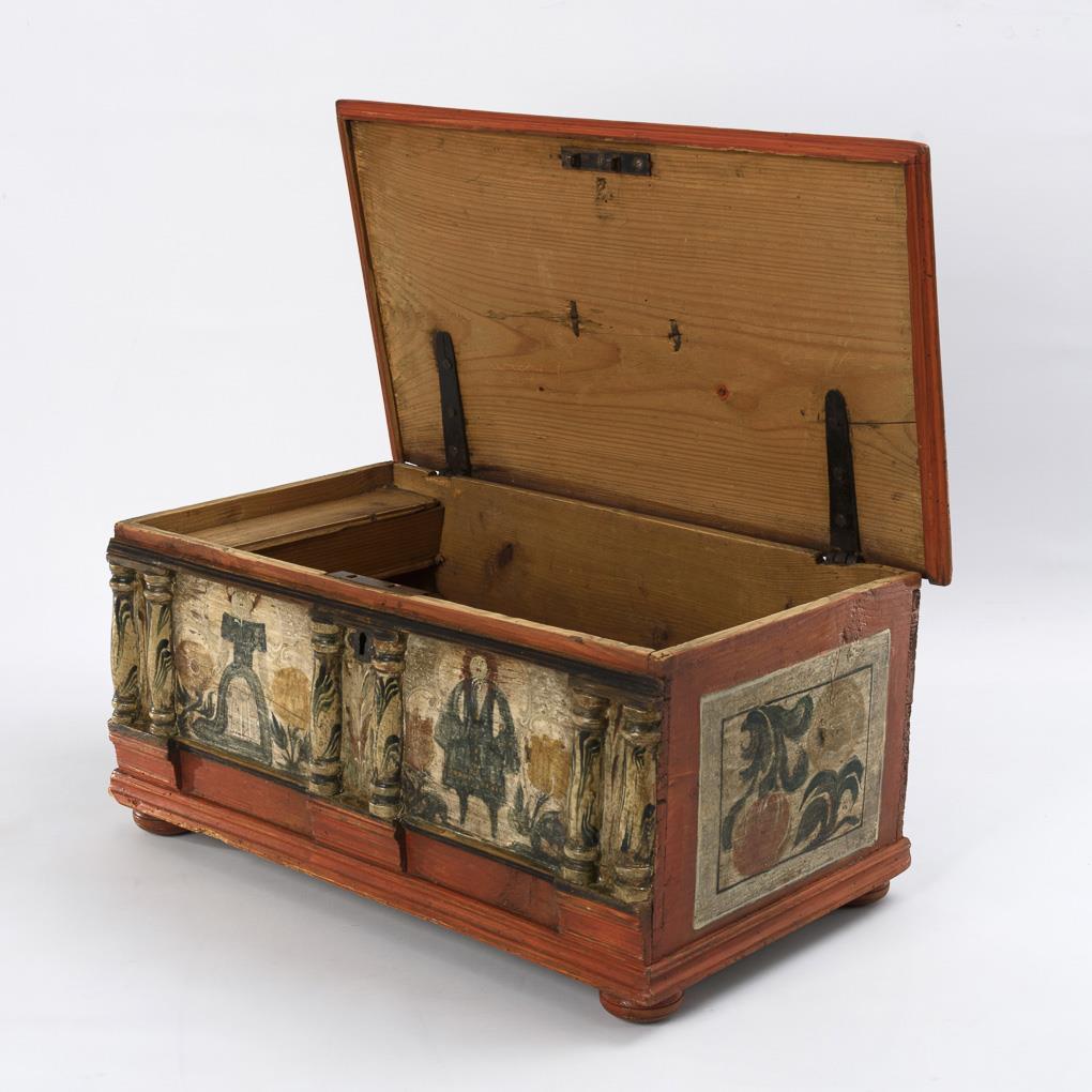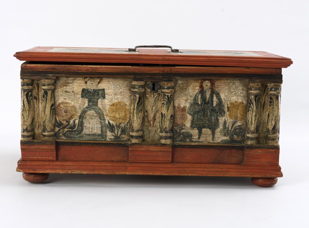 Wedding chest with vermilion ground color, standing on pressed ball feet. In the profiled front 6 marbled, paired half-columns, on the two picture fields a woman and a man between flowers. Painted mock cassettes with peasant flowers on the sides and on the hinged lid as well as a carrying handle at the top. Inside sideboard as glove box. / Comes with the book "Bemalte Möbel aus Thüringen", in which this chest is illustrated. Restored, some signs of age/use, few traces of use, lock replaced.
