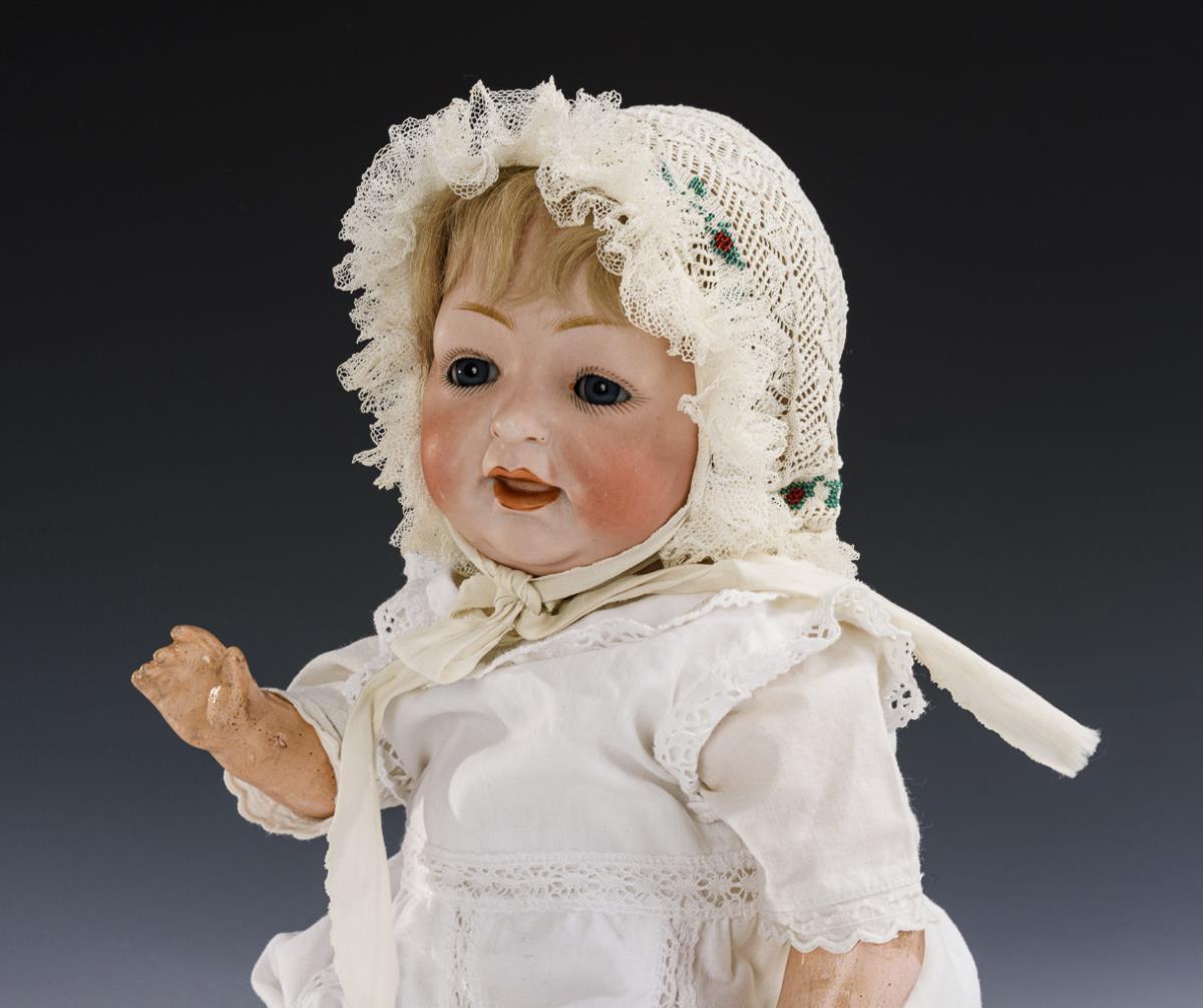 Cranked head, blue sleeping eyes, blond mohair wig. 5-part sitting baby body. White dress, beautiful old bonnet with pearl embroidery. Head cover firmly plastered; not x-rayed: no defects visible. Body partially overpainted.