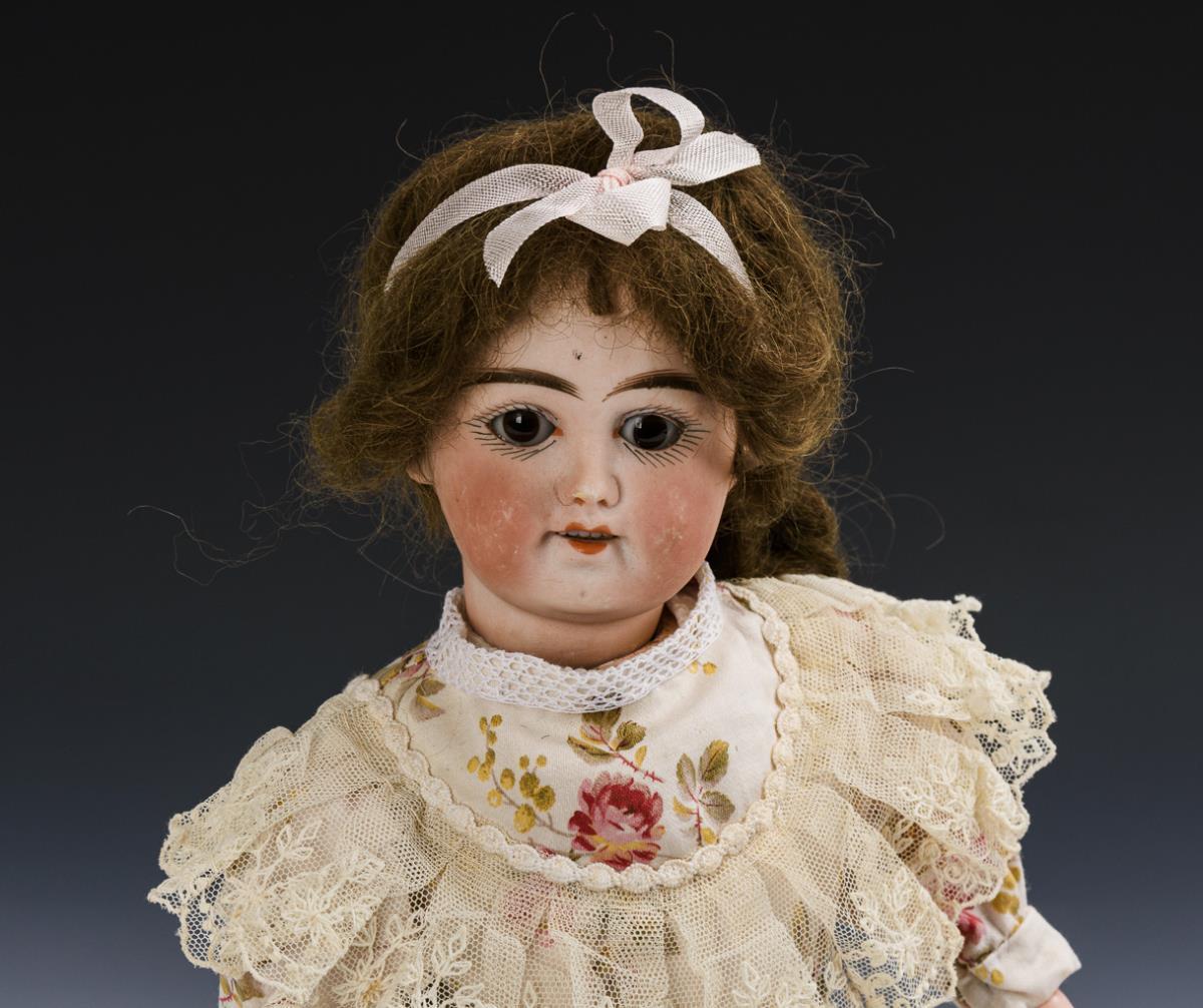 Cranked head, brown sleeping eyes, brown curly mohair wig on firmly glued head cover. 15-part jointed body. Flowered dress in old style, brown leather shoes. Head not x-rayed: no defects visible. Right leg with dry tear.