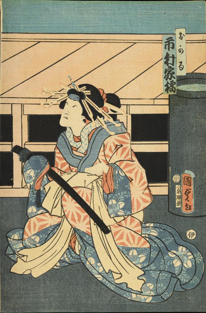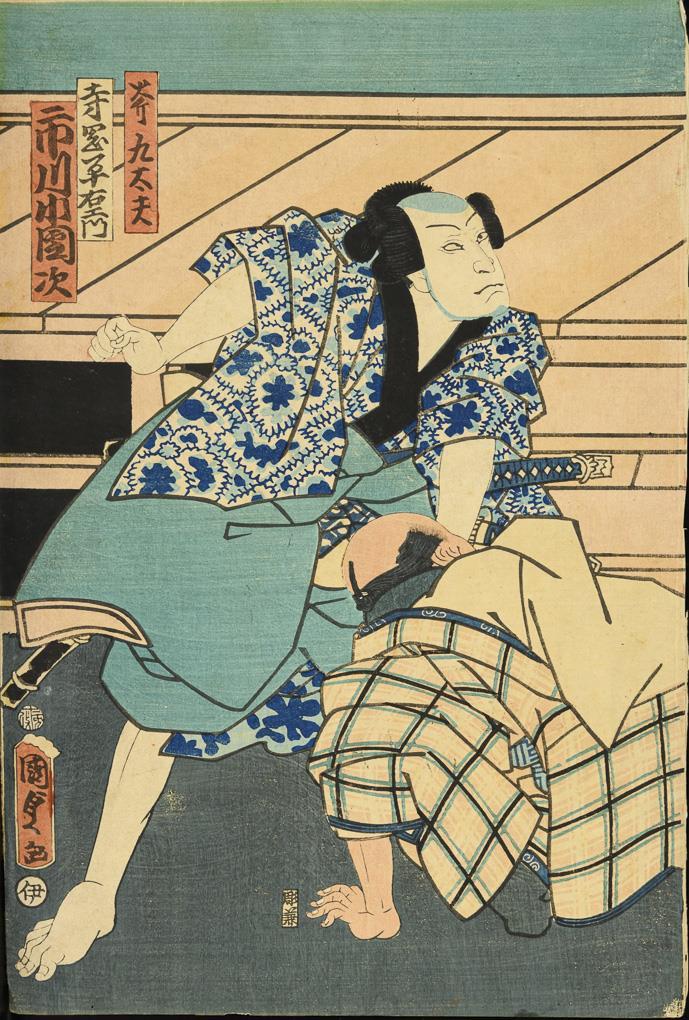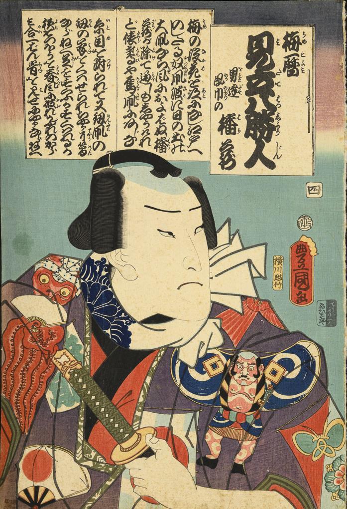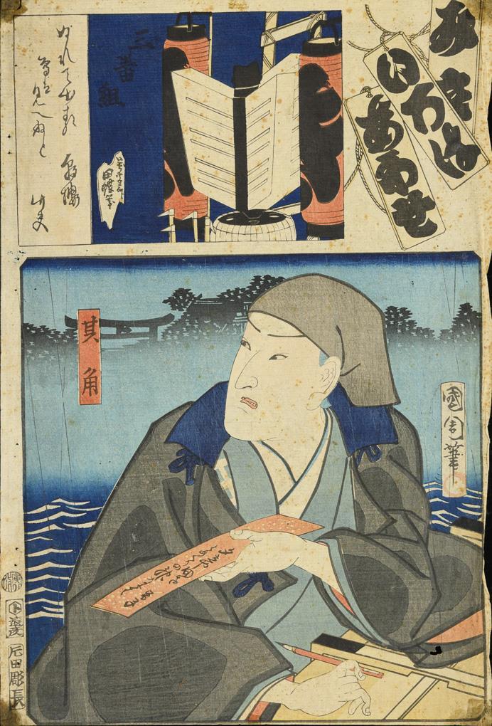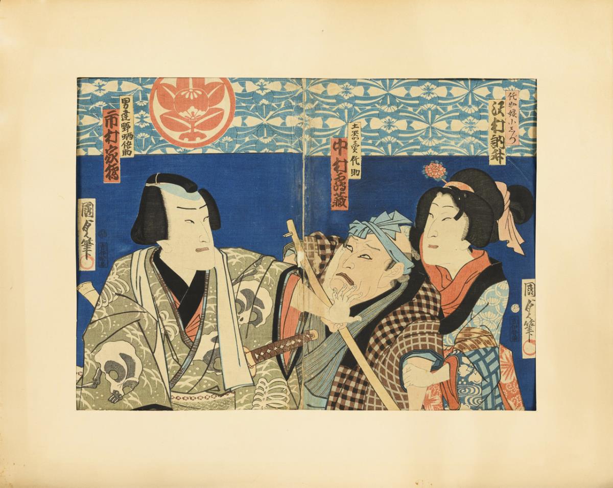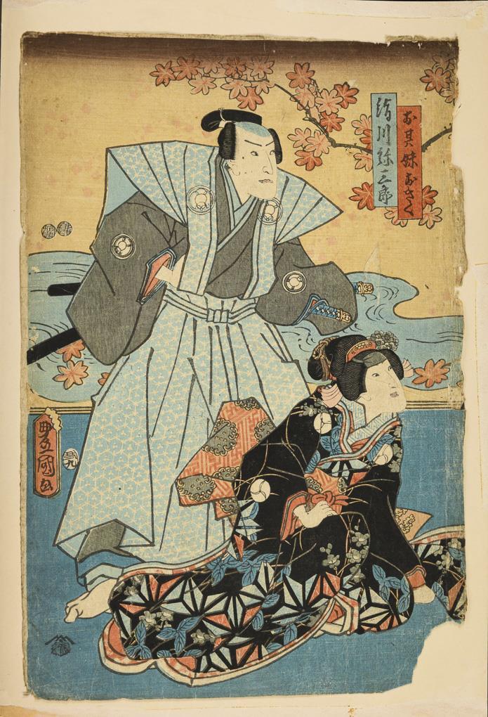 Triptych: men and a woman with swords, probably Kunisada. Together 36 x 74 cm. / Sheet of a samurai, probably Toyokuni, 36 x 25 cm. / Print on thin paper, image of a scribe in front of the silhouette of a torii. Probably by Kunichika, 35 x 23.5 cm, with small holes. / Two parts belonging together. Each with a samurai and a lady. Probably by Toyokuni. With heavier marginal damage, on backing paper, each approx. 37 x 25 cm. / Small woodcut with three figures and characters. 18 x 12.5 cm, in passepartout. / Joined two-part woodcut with three figures. Verso with text. Probably by Kunisada. Together 34 x 47 cm, in passepartout.