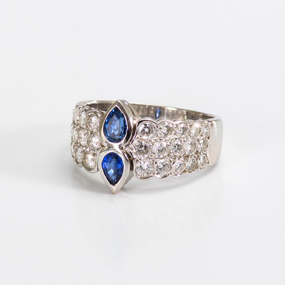 Brillanten zus. ca. 1,68 ct/H/si. Saphire je 5 x 3,5 mm. Ringgröße 58.