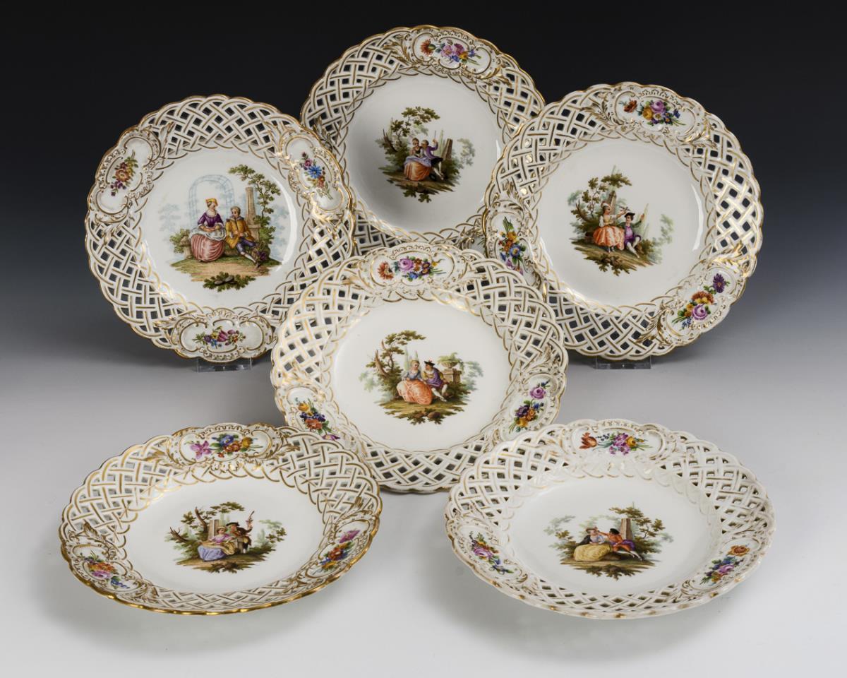 6 pierced plates with Watteau painting. Oldest Volkstedt.