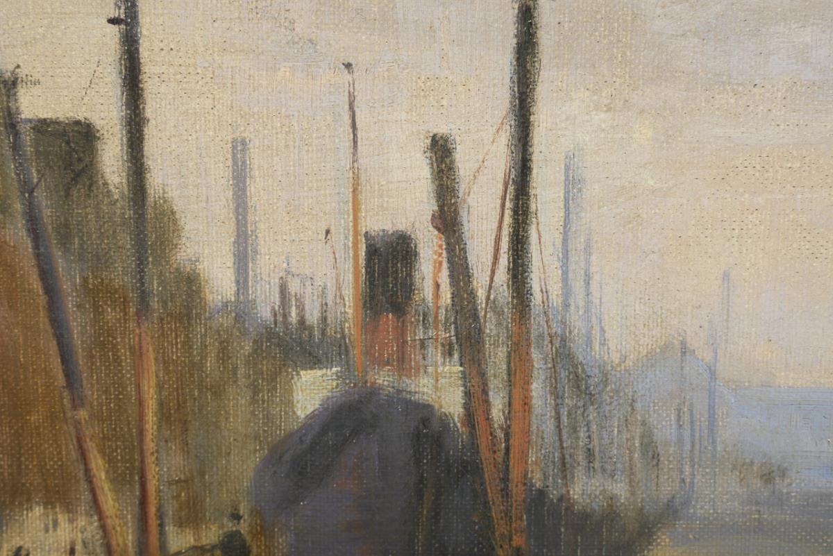 Many ships on the quay between the townhouses under a gray overcast sky. One small restored area with backing.