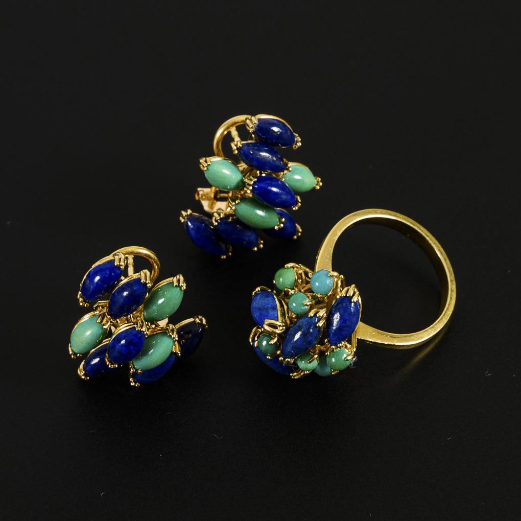 Cocktail ring and pair of stud earrings with lapis lazuli and turquoise.