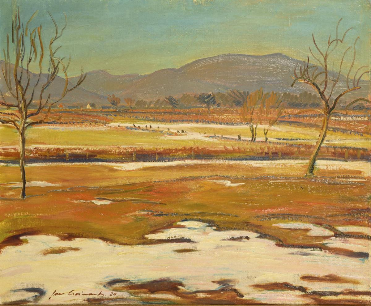 Melting snow in the wide plain on a sunny day under a blue sky.