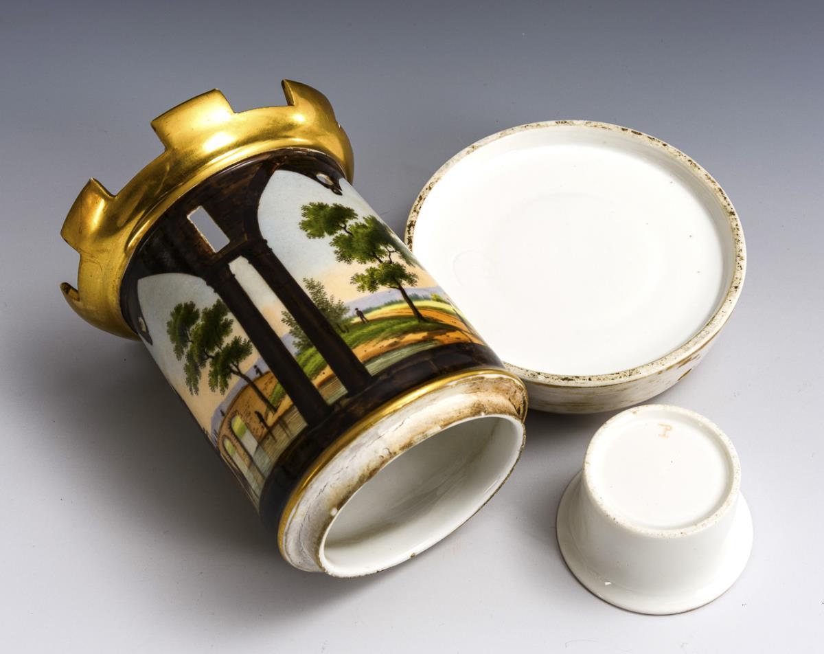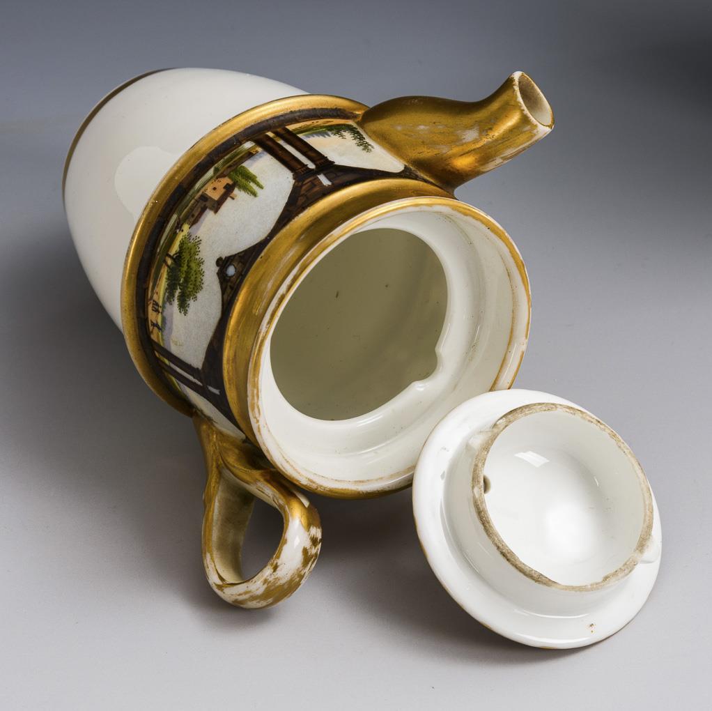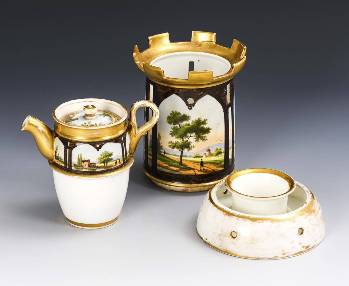 Tower-shaped, two-part teapot with teapot and burner, surrounding depiction of a landscape with castle. Gold partly rubbed, 1 battlement glued, both lids chipped.