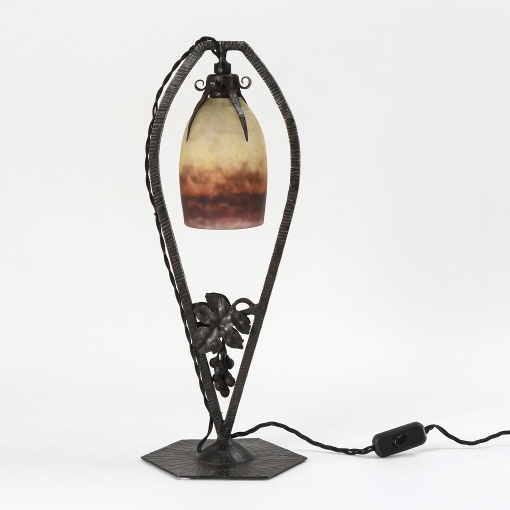French table lamp with iron base and glass shade. Muller Fres Luneville.