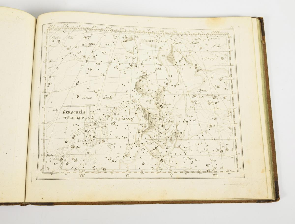 No further details. 34 copper engravings with scientific depictions of stars and constellations, combined with pictorial representations of constellations. Title page inscribed "D. Berger Sculp. 1805". Pencil notes on constellations on flyleaf. Half leather binding.