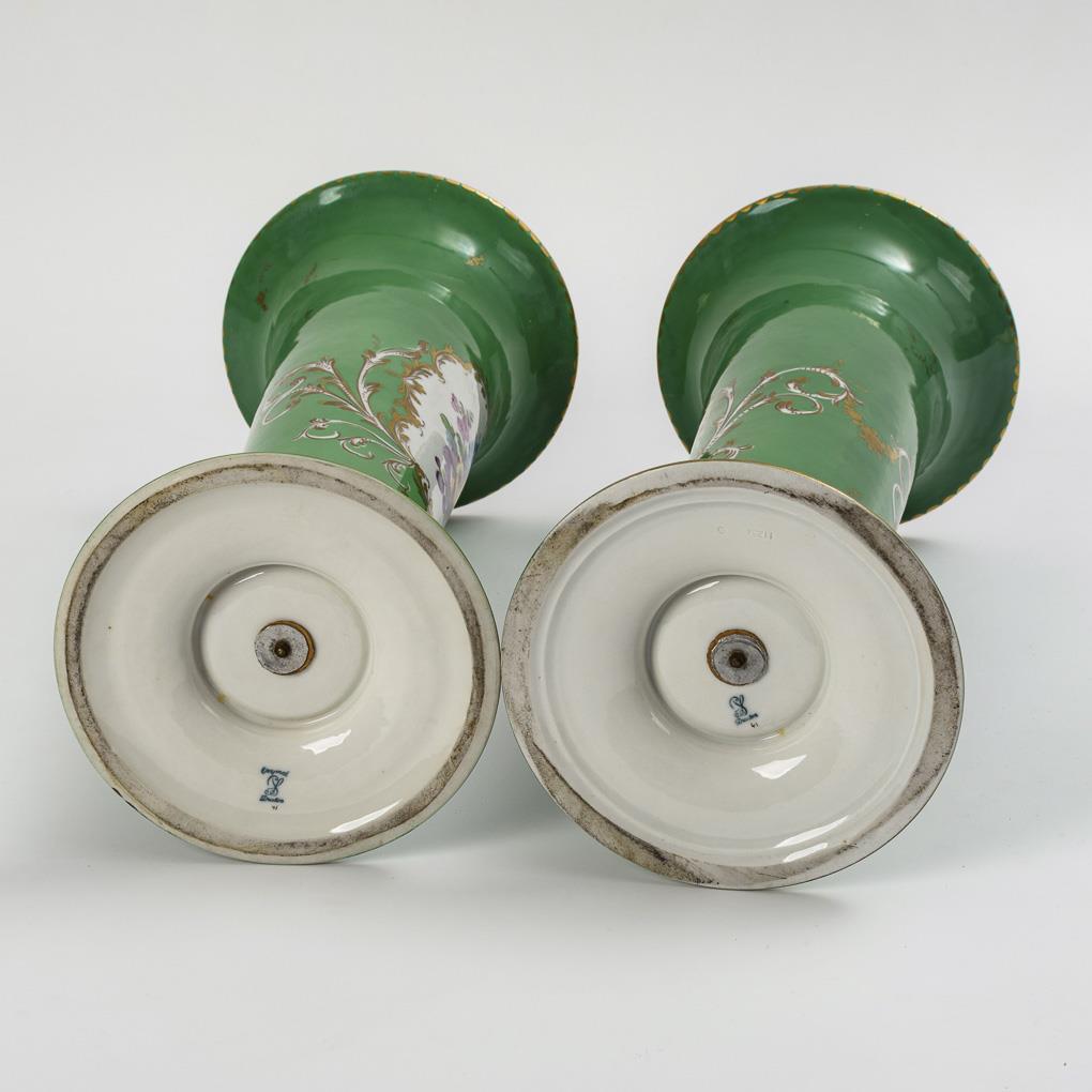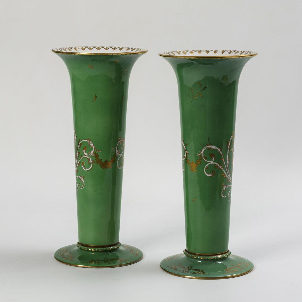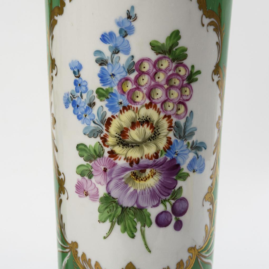 Slim crater shape, round base. Green background, on the front a floral gold-framed cartouche with a bouquet of flowers.