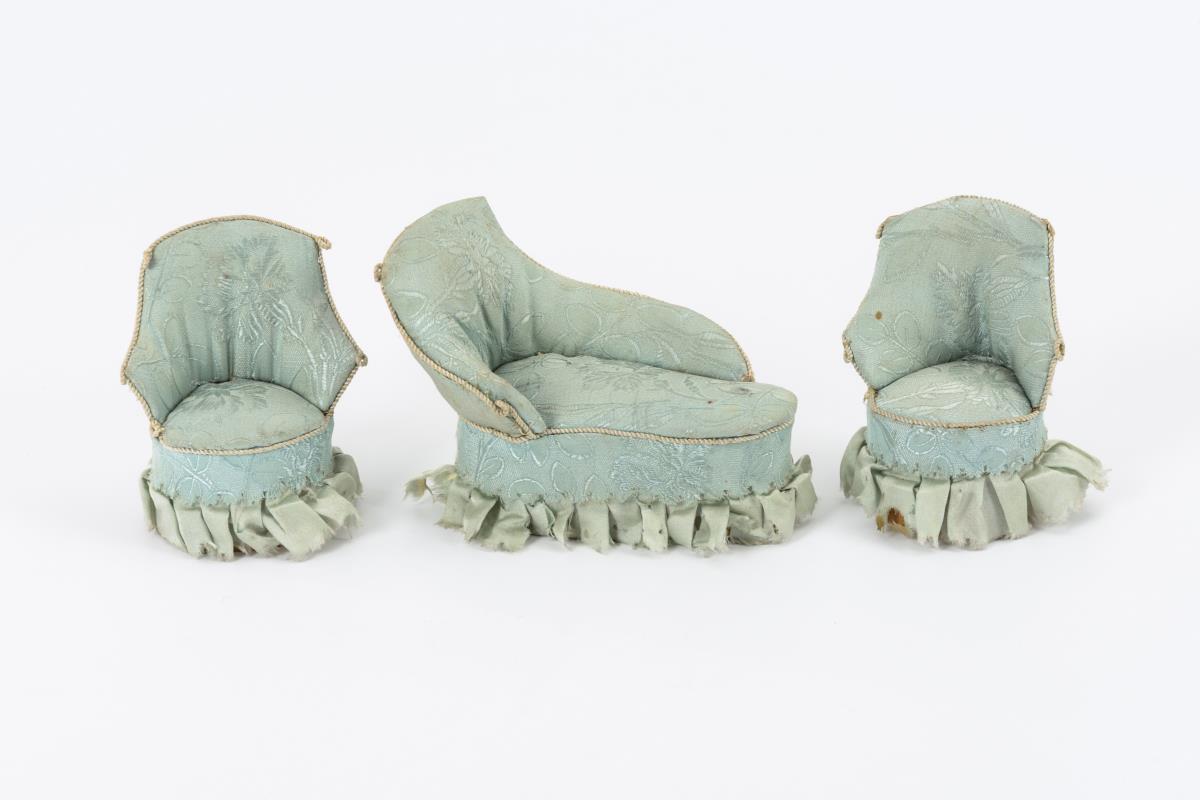 3 Golddruck-Möbel und 3-teilige Sitzgruppe für die Puppenstube.