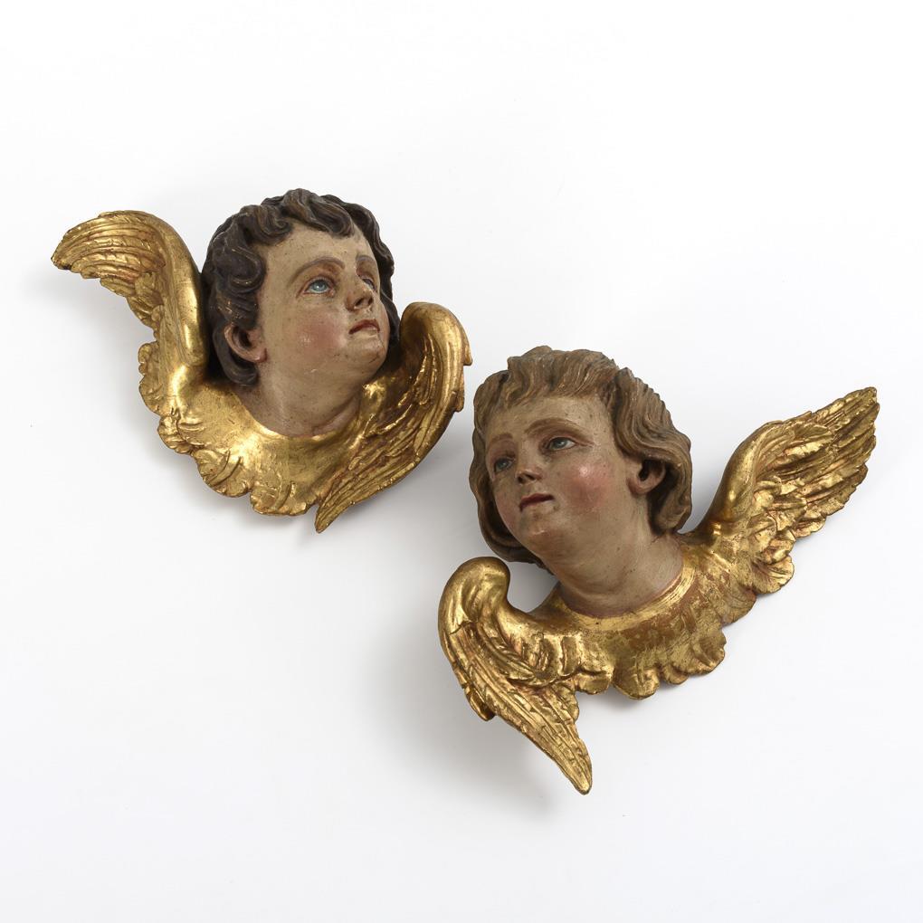 Approximately mirror-image angels' wings with finely painted faces. Some minor signs of age/use.