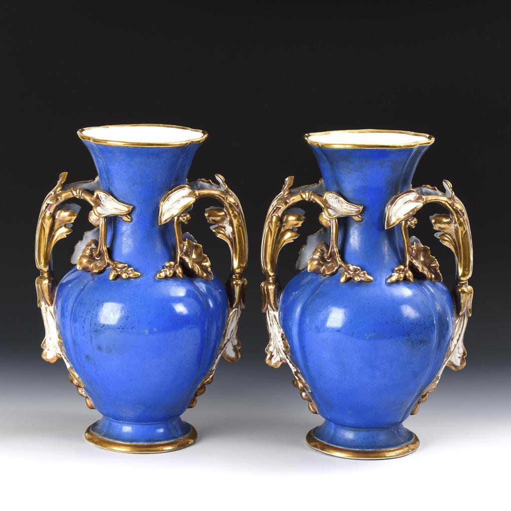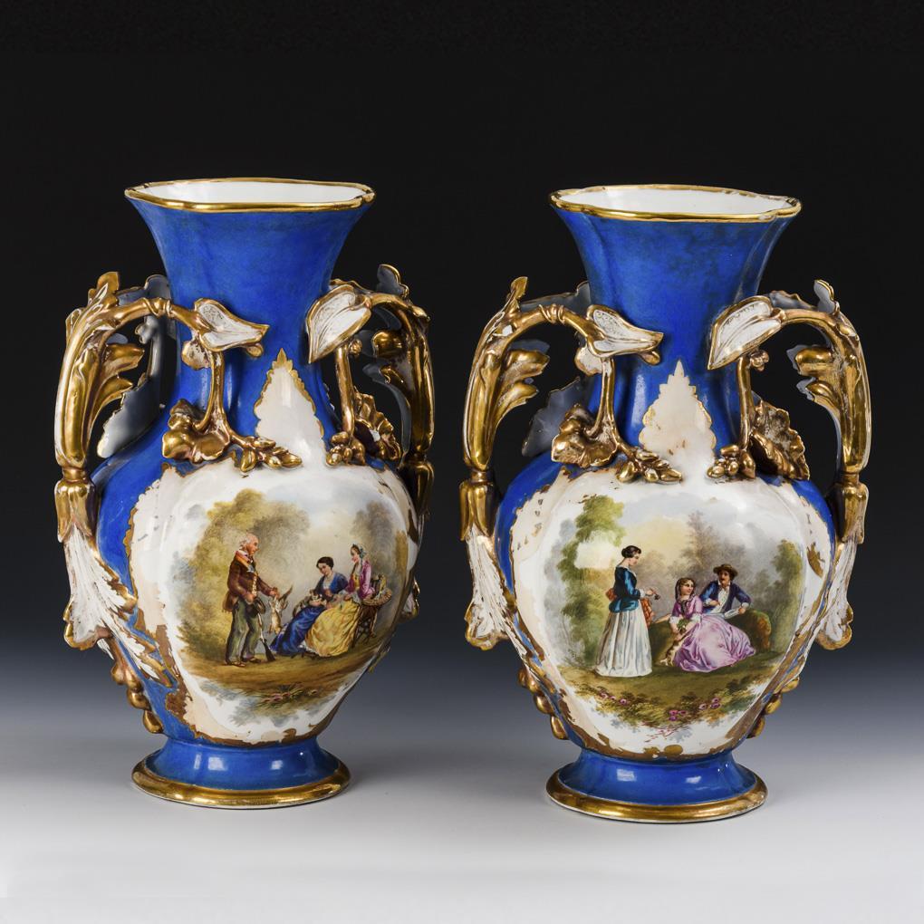 Baluster vases with two floral handles. Blue ground, each with a large cartouche on the front depicting a small company in a park landscape and a hunter with two ladies. Gold rubbed, 2 handles minimally chipped.