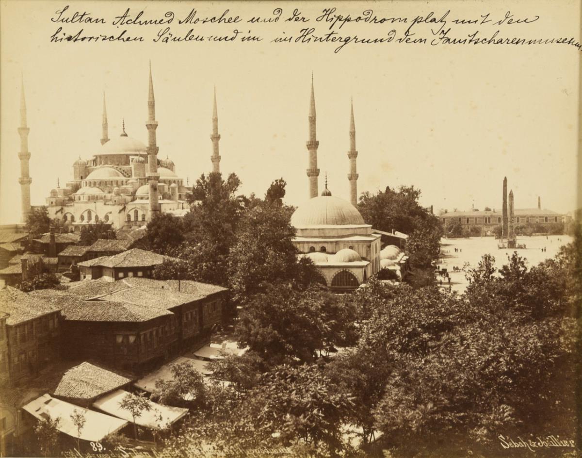 2 early photographs of Istanbul, handwritten title "Sultan Achmed Mosque and the Hippodrome Square with the historical columns and in the [sic!] background the Janissary Museum", signed in the image: "Sébah & Joaillier", inscribed "Beyreuther" | "Moschee Aja Sophia (früher Sophienkirche). Stambul. Constantinople", signed in the image: "Sébah & Joaillier", inscribed "Beyreuther" in pencil at bottom right; the photographs were exhibited from 20.08. - 12.11.1995 in the Albertinum Dresden on the occasion of the exhibition "Im Lichte des Halbmondes. The Occident and the Turkish Orient".