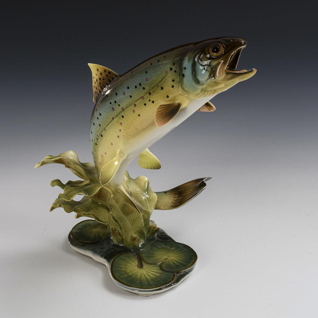 Trout jumping out of the water on a water lily. Small, color-retouched bump on the tail fin.