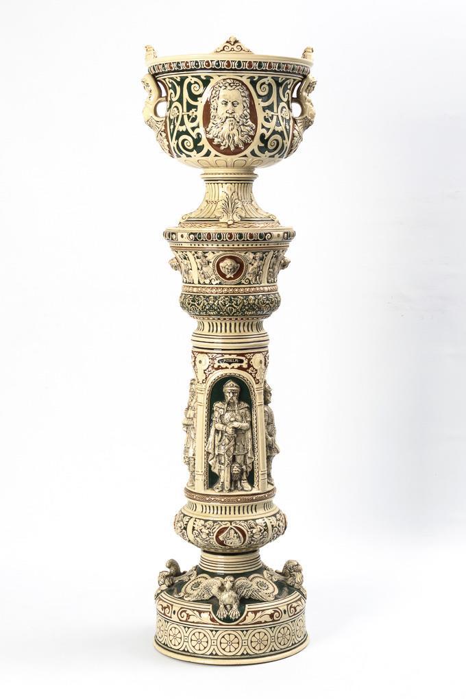 Relief column with rich historicist figural and floral decoration and mixed figures. Surrounding niche and coat of arms decoration with the inscribed kings "Attila", "Nebuchadnezzar", "King Richard" and "Clovis". Flower cachepot in the shape of an urn. Base and stand cracked, figures on the stand partially bumped and with defects.