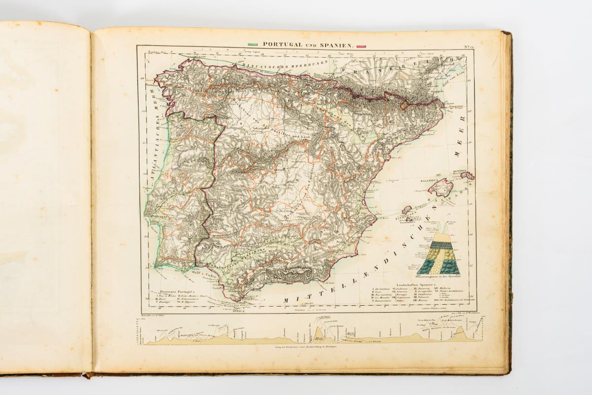 Detailreiche, farbig lithographierte Karten mit Profilquerschnitten, Vegetationszonen, Strömungen und Profilen von Flußläufen u.a. .