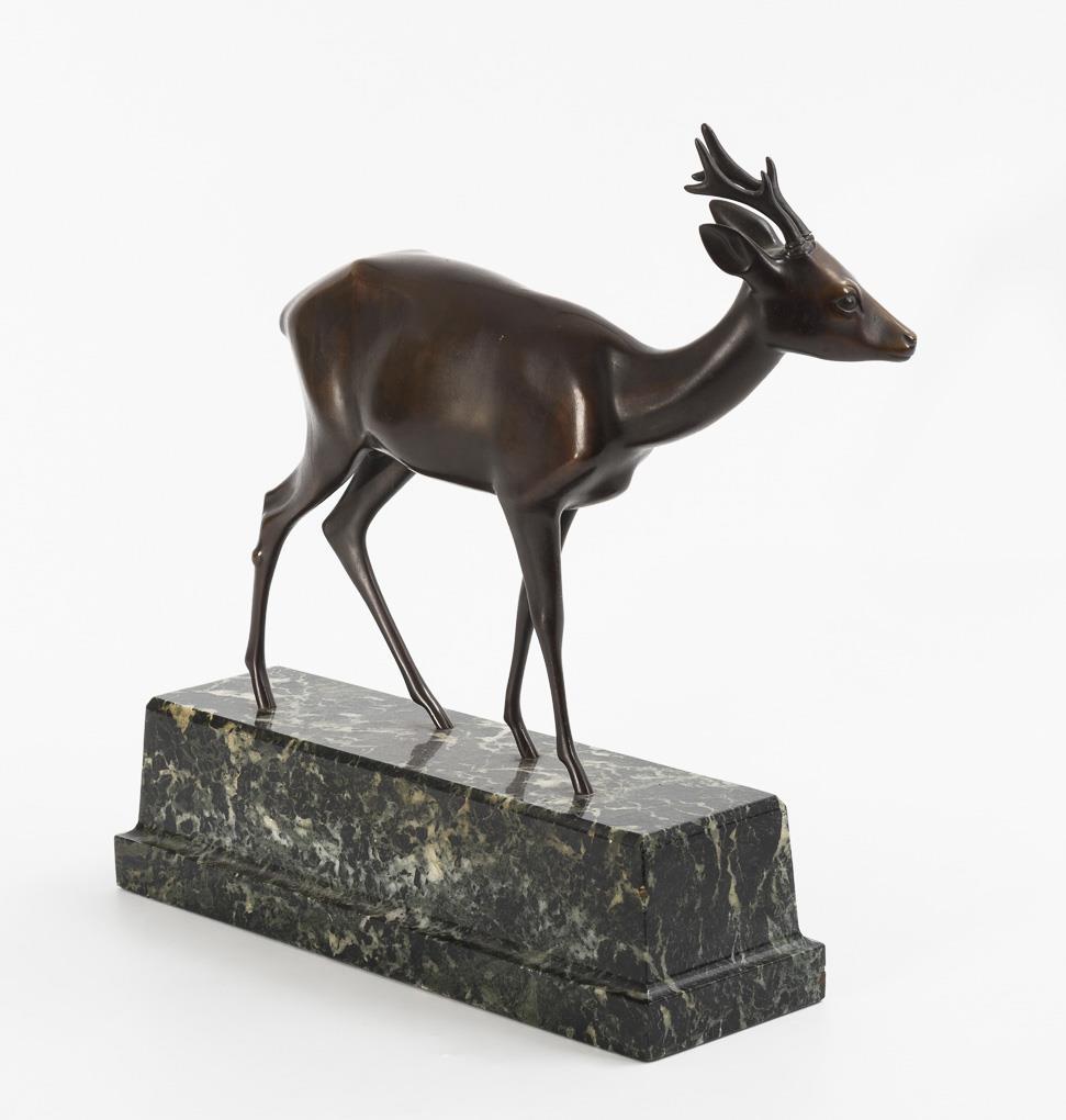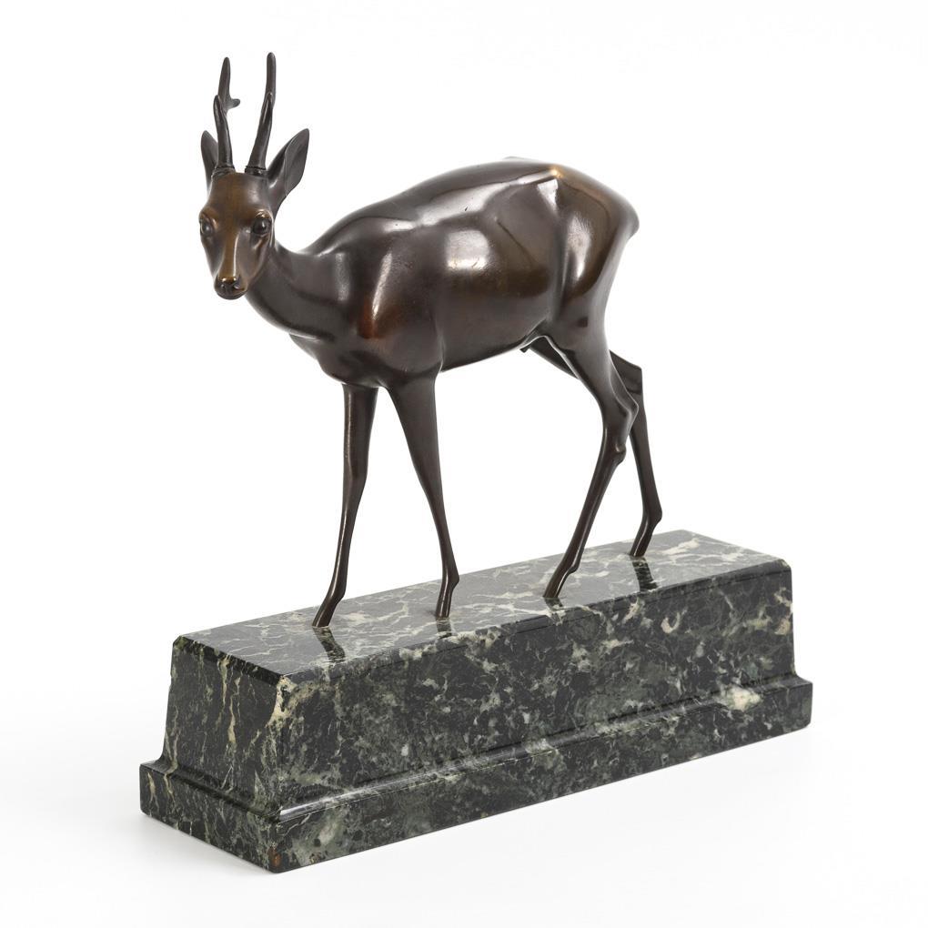 Slightly stylized animal with an exciting smooth surface, its horns screwed on. 1 minimal scratch, patina barely visibly soiled.