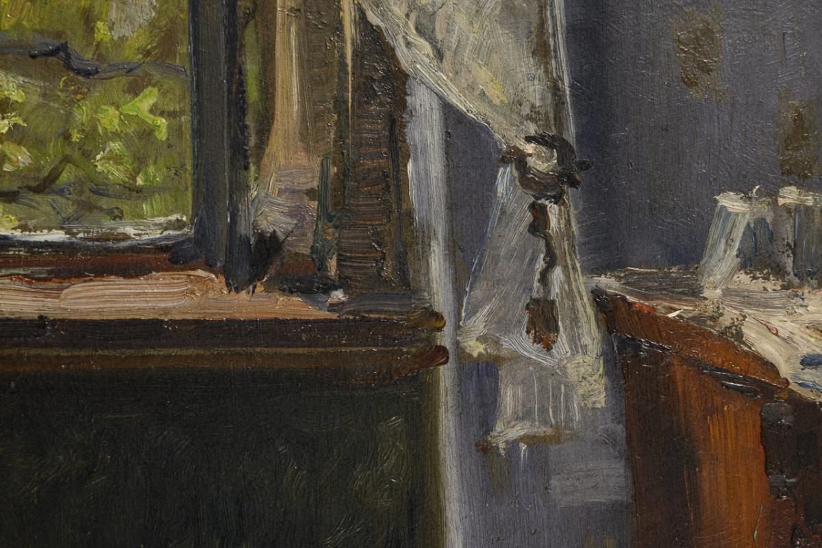 Bedroom with bed, chest of drawers and shoes in front of the open window.