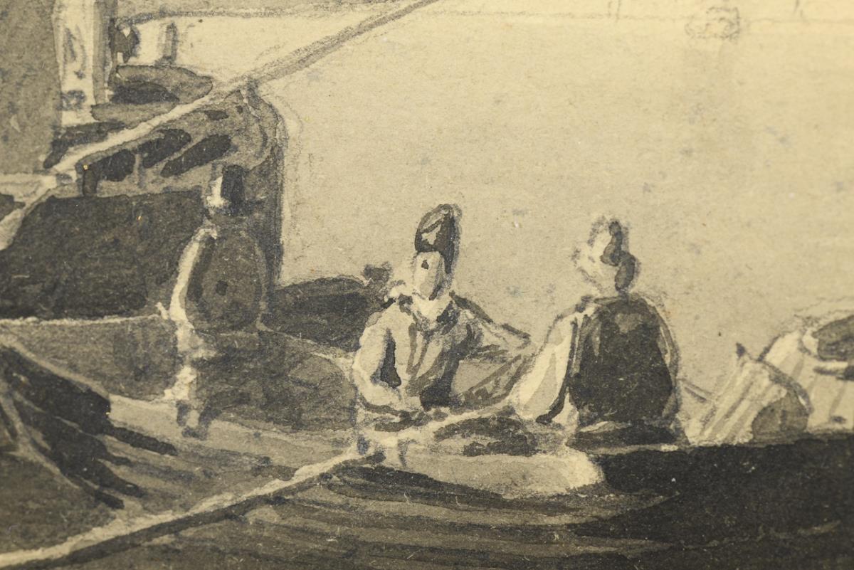 Genre scene with several boats near the beach in the sunshine.