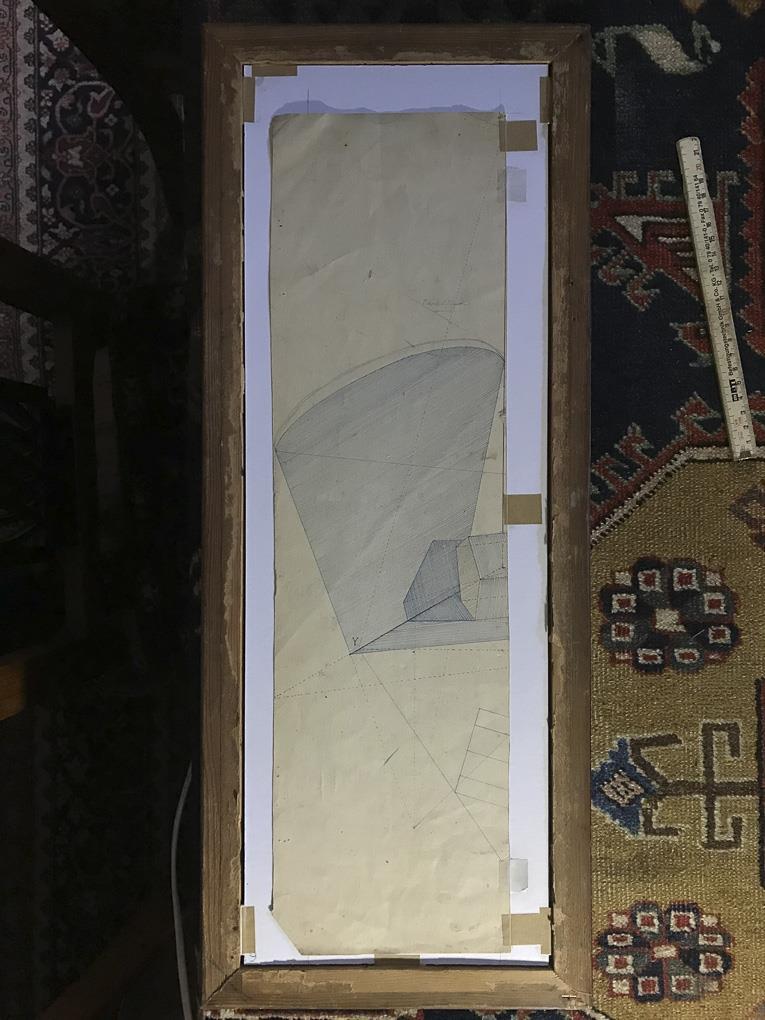 Passepartout cut-out 13 x 53 cm. Framed & behind glass : 28 x 64.5 cm (dark frame).