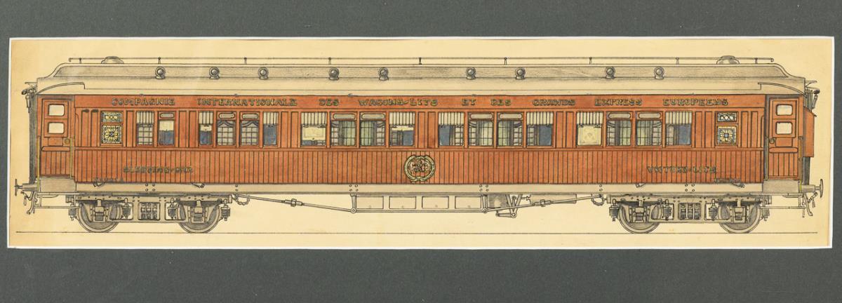 View of a sleeping car with the inscription "Compagnie Internationale des Wagons/Lits et des Grands Express Europeens", which was later part of the Orient Express. Slight creases.