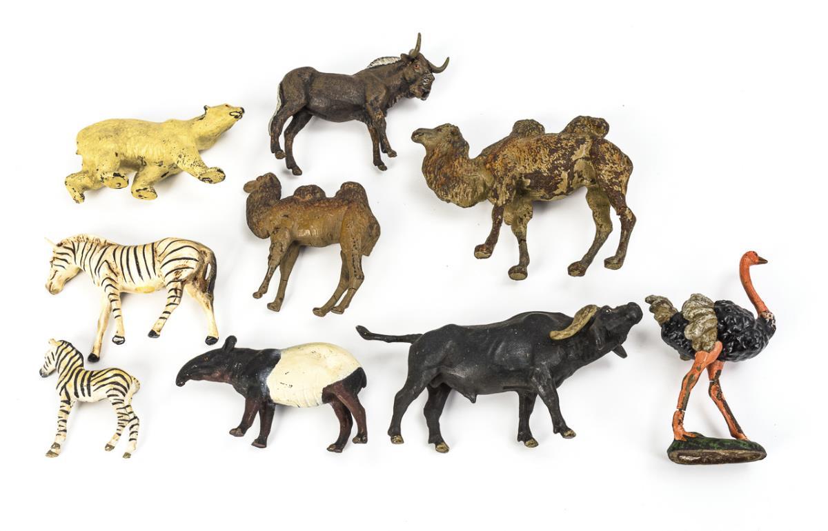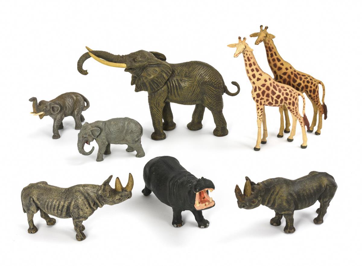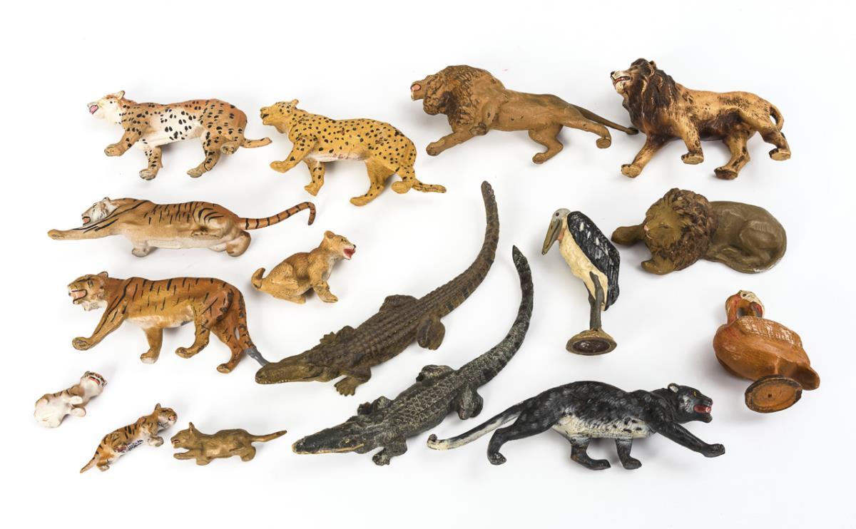 Approx. 30 African wild animals: 3 elephants, 2 giraffes, 5 lions, 4 tigers, 2 zebras, 2 crocodiles etc. Plus 7 fence elements made of branches. Small defects and repairs.