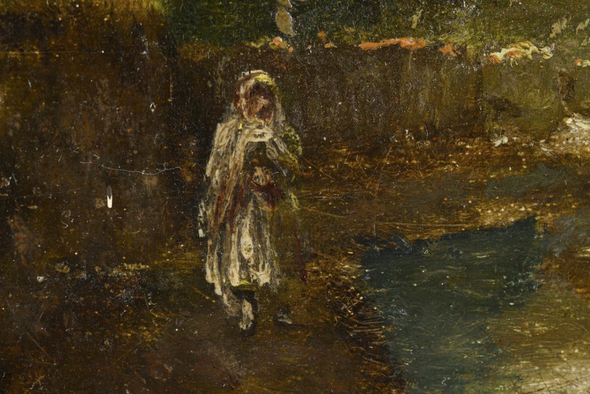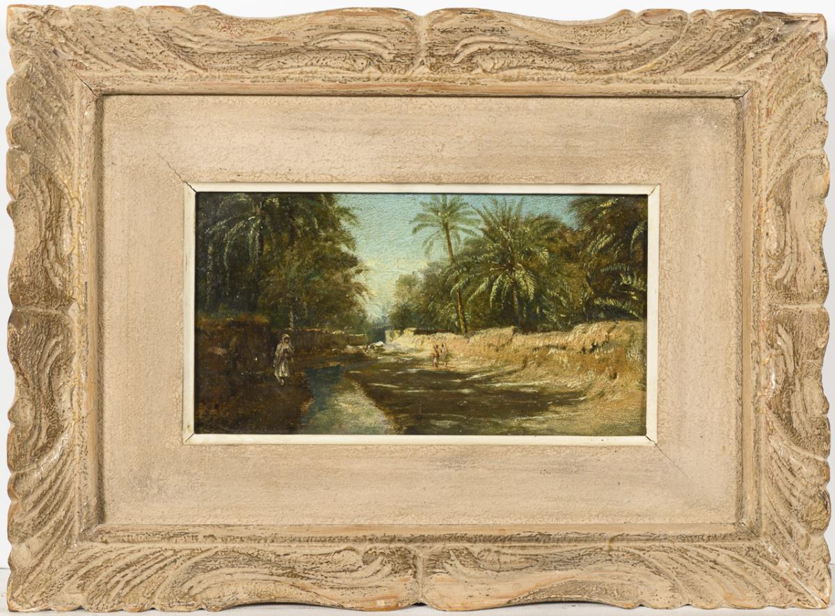 Staffage figures in the riverbed and in the shade of palm trees under a blue sky.