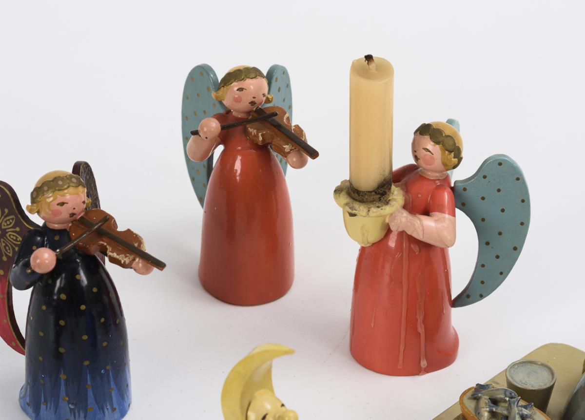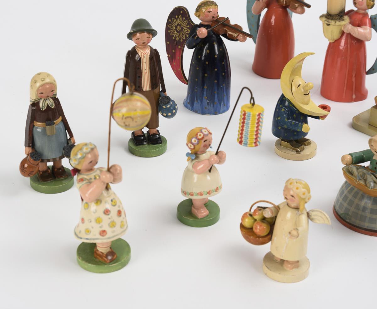 Various wooden figures, including angels, market women, wandering boys, lantern children etc. Parts with small defects and missing parts.