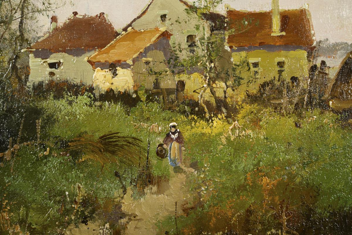 Staffage figure on a path near the village under a cloudy sky.
