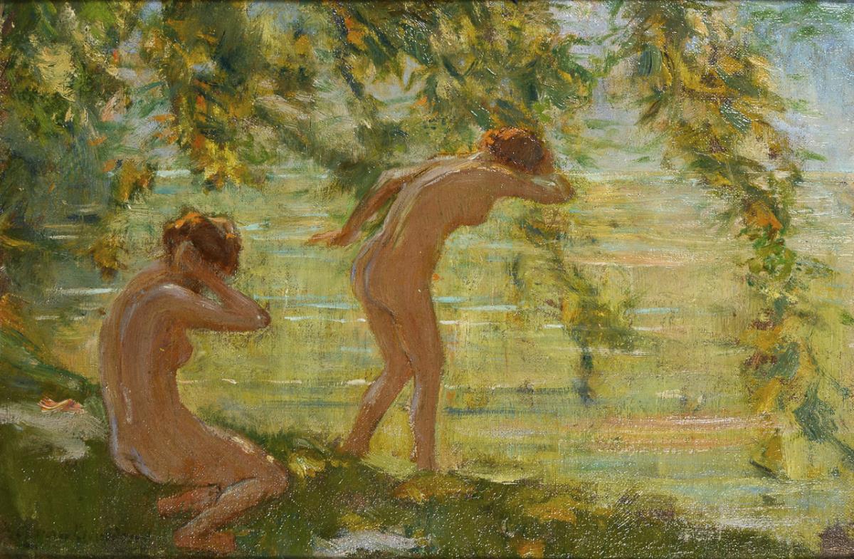 Two naked women in the shade of a tree on the lakeshore. Slight traces of age.